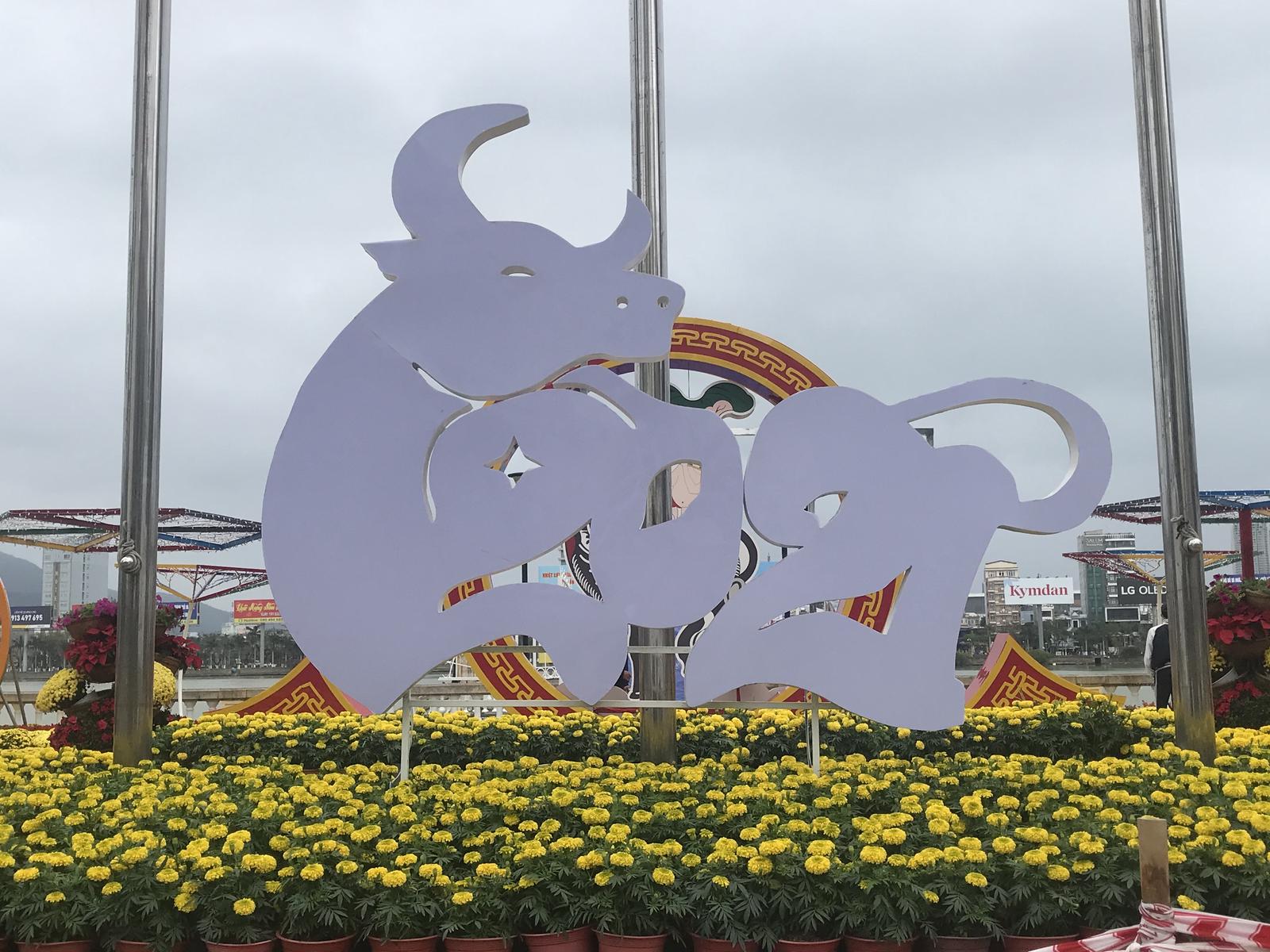 Biểu tượng con trâu vàng tại điểm trang trí hoa Tết trước Trung tâm Hành chính TP Đà Nẵng. Ảnh: N.P