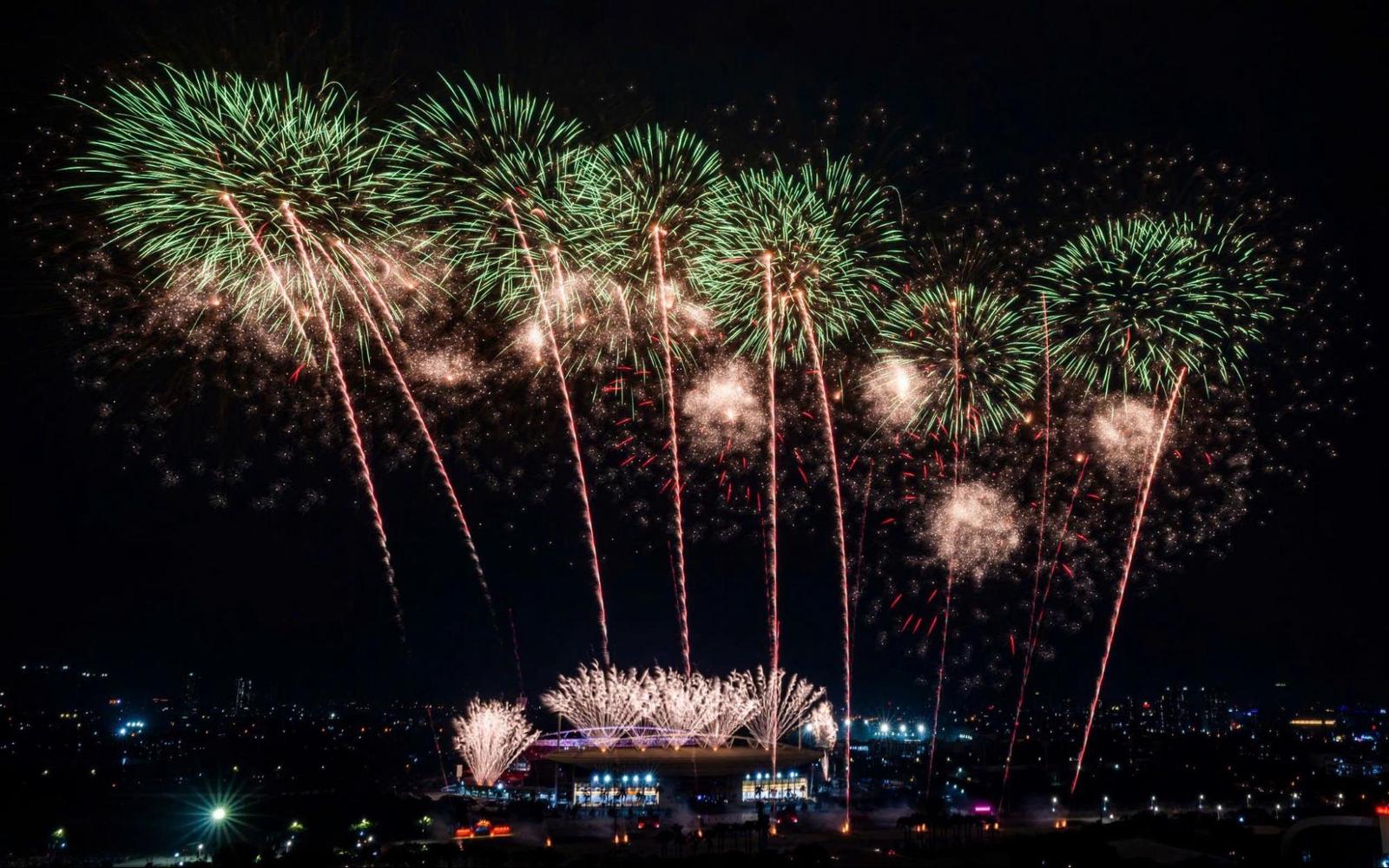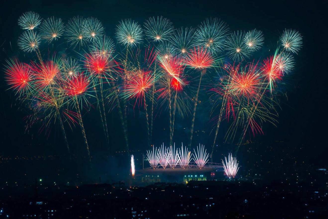 Ở những cao trào của chương trình, hàng nghìn quả pháo hoa tầm cao đồng loạt khai hỏa, kết hợp hệ thống giàn phun hỏa thuật trên mái và hai cánh khán đài, đẩy cảm xúc khán giả lên đỉnh điểm.