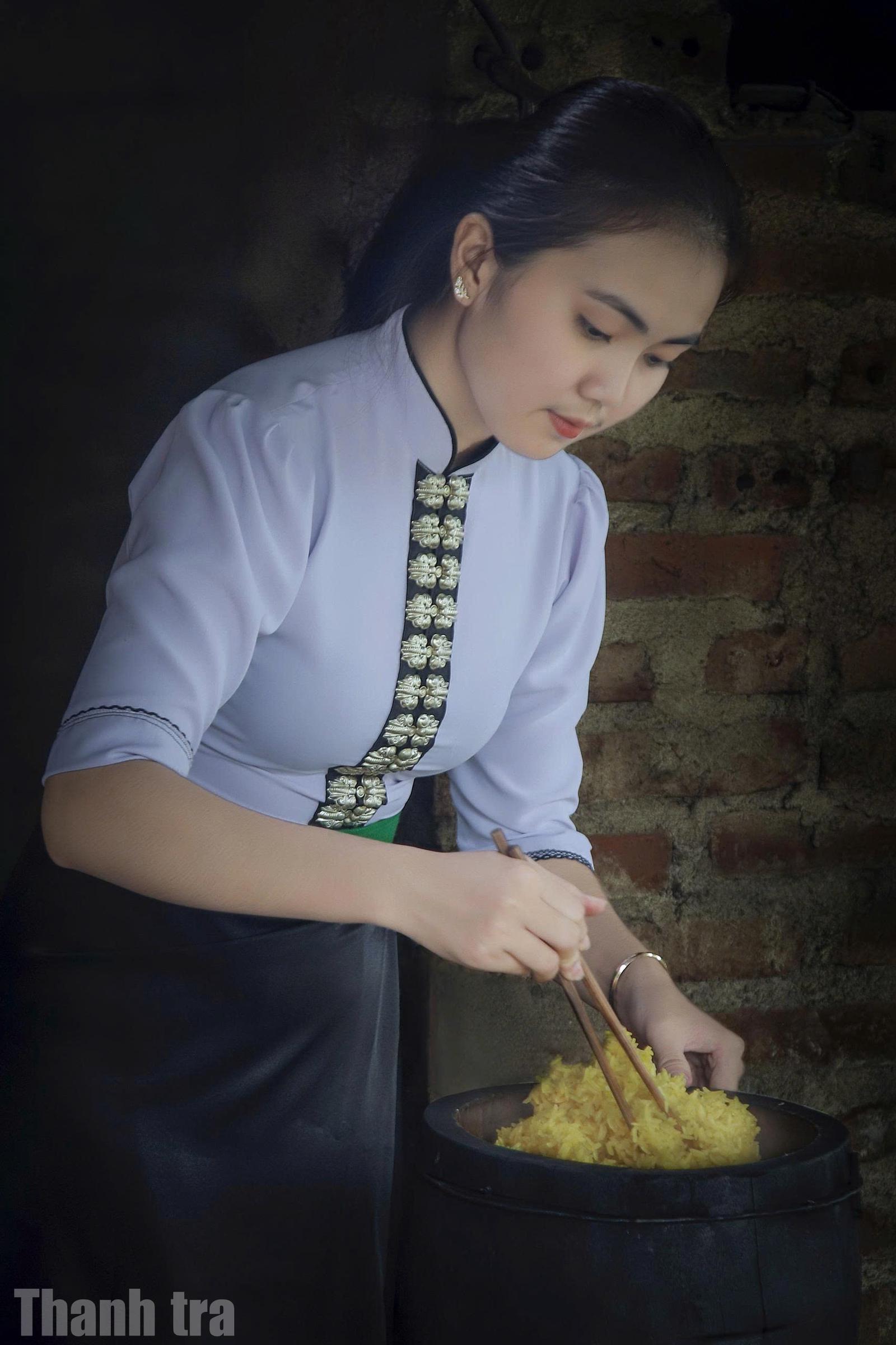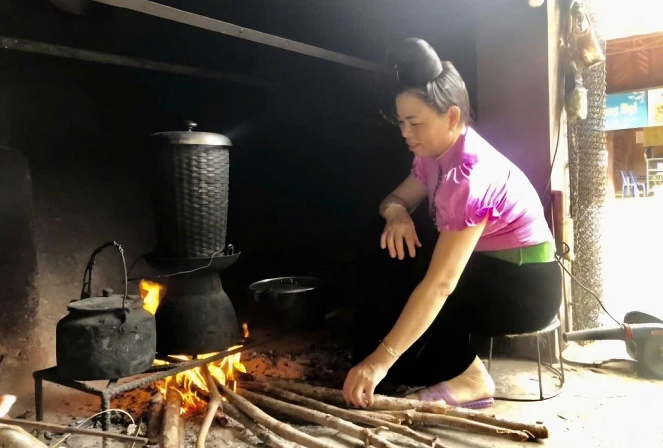Bên bếp lửa hồng, người phụ nữ Thái cần mẫn đồ xôi - hương nếp mới quyện trong hơi ấm của núi rừng. Ảnh: Điện Biên
