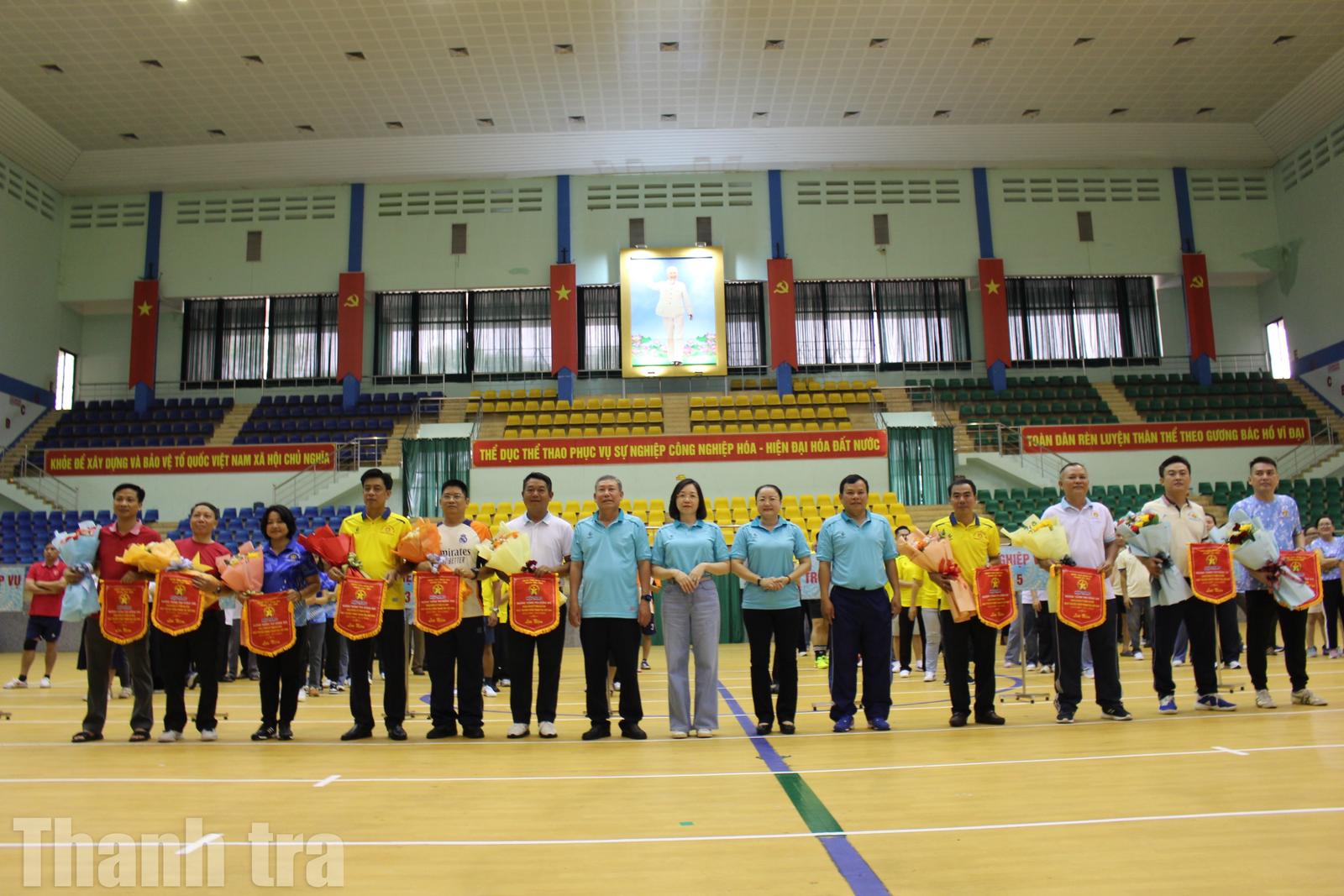 Lãnh đạo Thanh tra tỉnh trao cờ cho các trưởng đoàn trước giờ thi đấu. Ảnh: Minh Nghĩa
