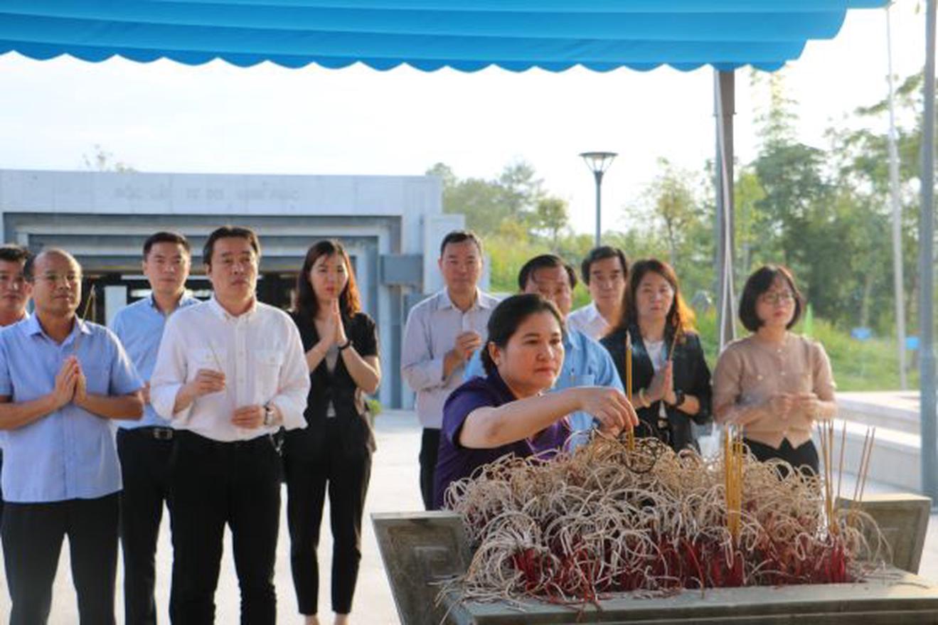 Tiếp đó, đoàn đã đến dâng hương tưởng niệm các Anh hùng liệt sĩ tại Nghĩa trang liệt sĩ Quốc gia A1. Trong không khí thành kính, trang nghiêm, xúc động, các thành viên trong đoàn đã đặt vòng hoa, dâng hương lên đài tưởng niệm và dâng hương lên từng phần mộ các Anh hùng liệt sĩ.