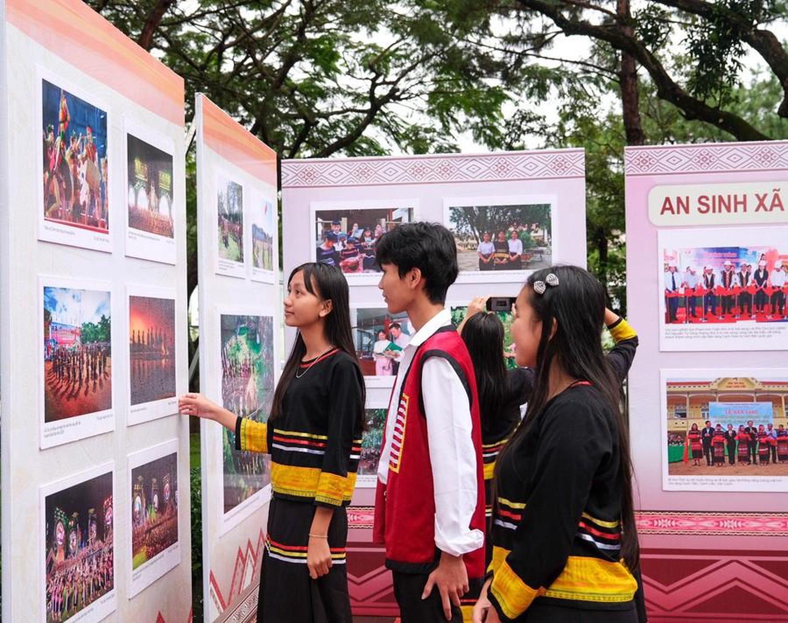 Học sinh Trường Phổ thông Dân tộc nội trú THPT số 2 tỉnh Gia Lai tìm hiểu sắc màu văn hóa các dân tộc tại triển lãm. Ảnh: MC