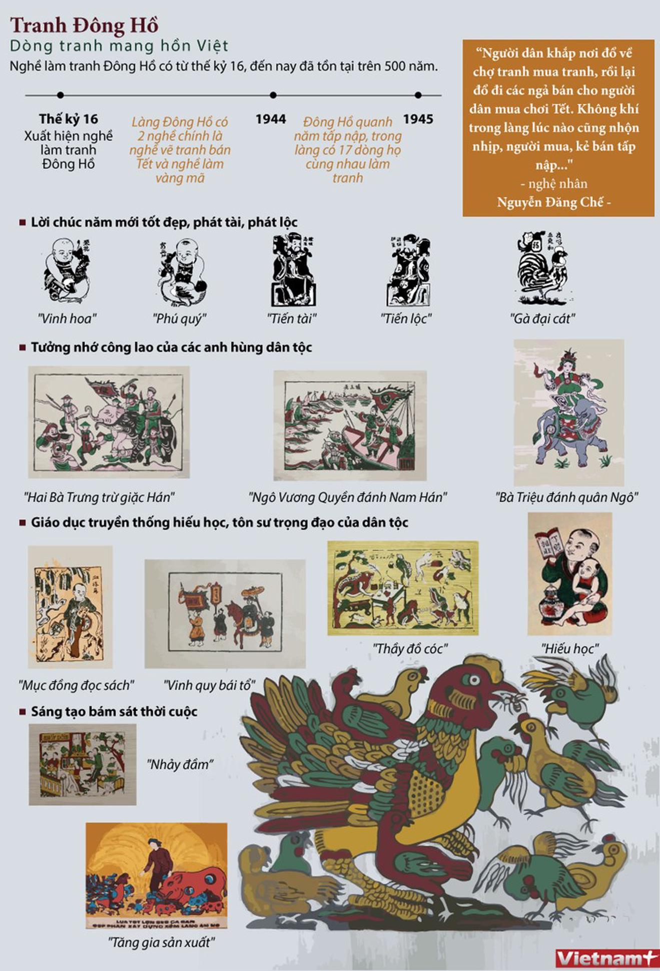 Nghề làm tranh Đông Hồ có từ thế kỷ 16, đến nay đã tồn tại trên 500 năm. Cho đến nay, vẫn chưa có ai nghe nói đến ông tổ làng nghề, tinh hoa của dòng tranh này được lưu truyền từ đời này qua đời khác.