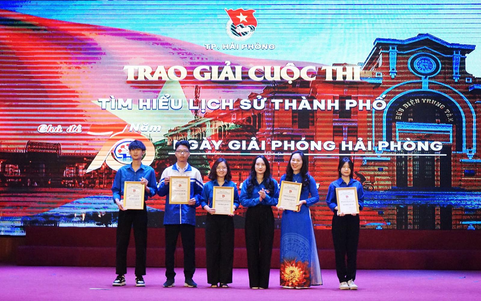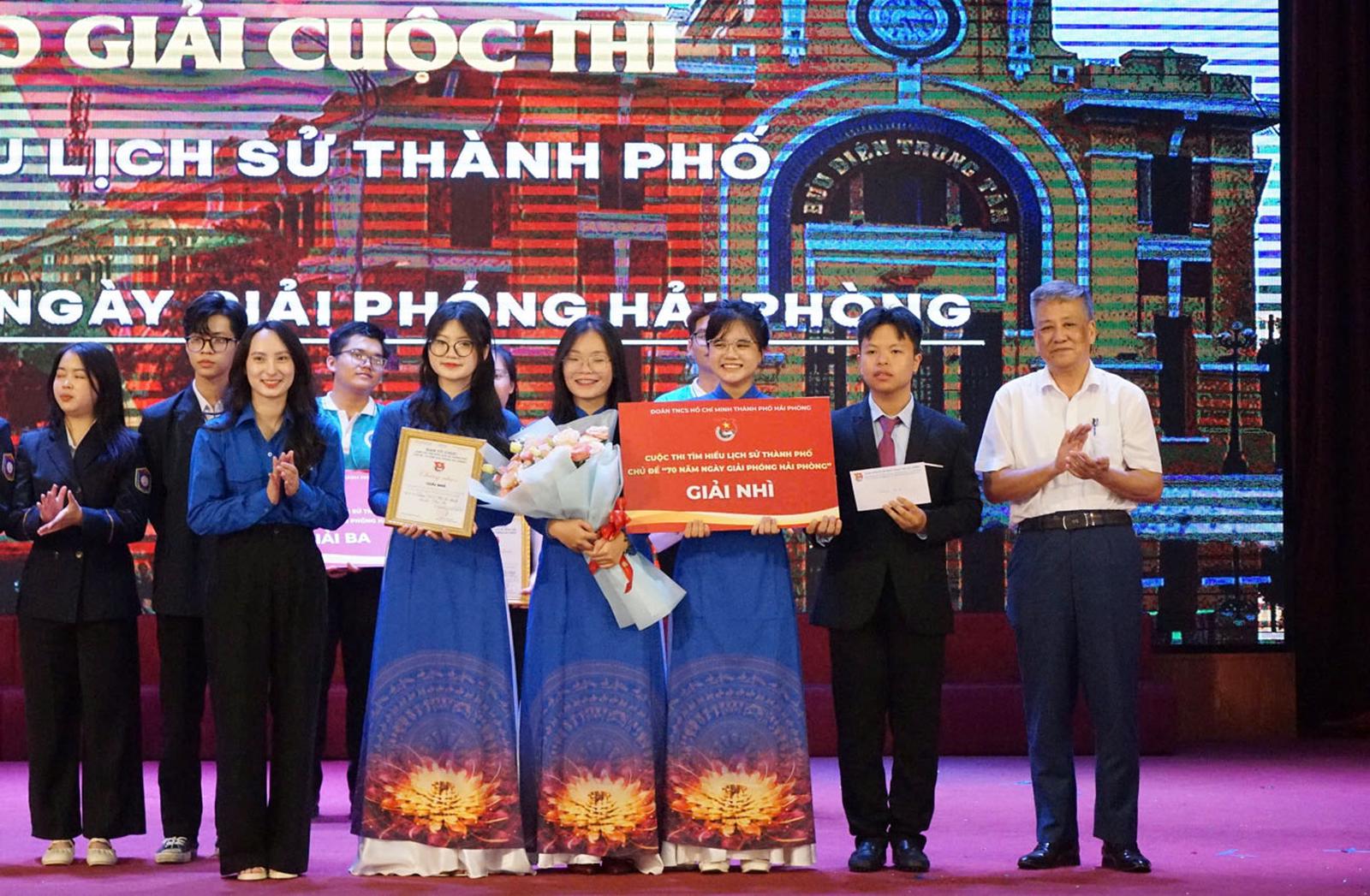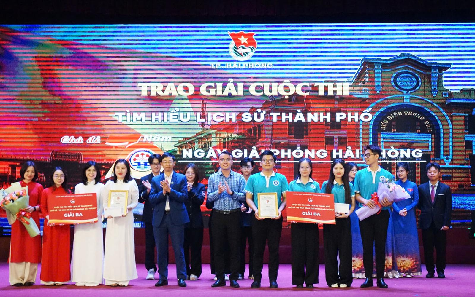 Ban Tổ chức trao giải Ba cho Quận đoàn Ngô Quyền và Đoàn Trường Đại học Hải Phòng. Ảnh: KT