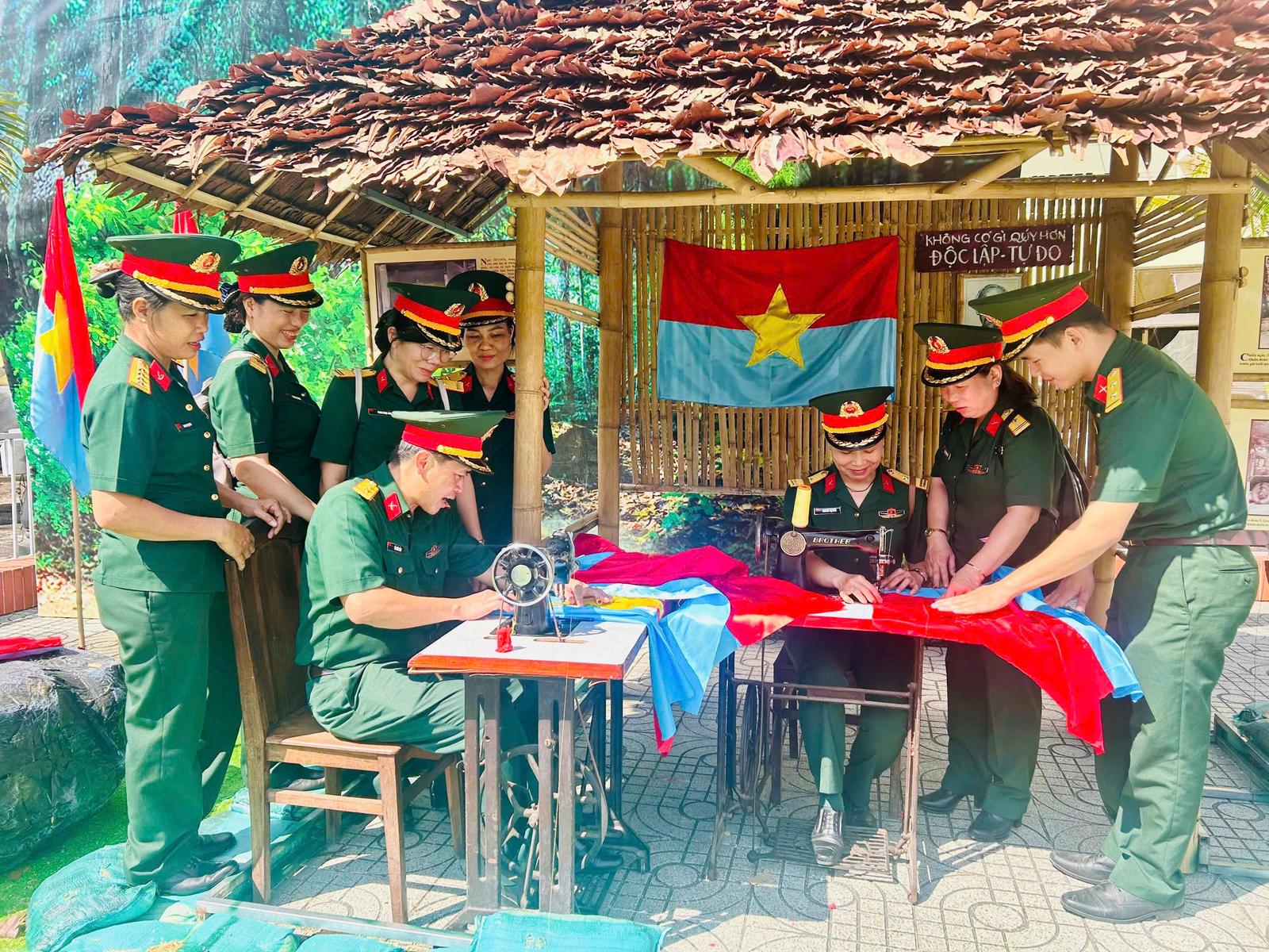 Các cán bộ, chiến sĩ Bộ Chỉ huy Quân sự tỉnh Bình Dương tham quan trải nghiệm may cờ giải phóng tại Bảo tàng. Ảnh: A.X