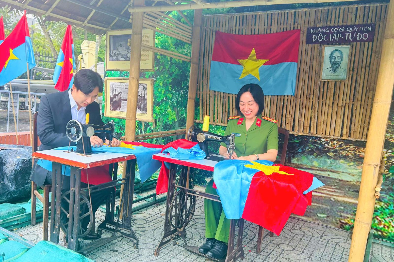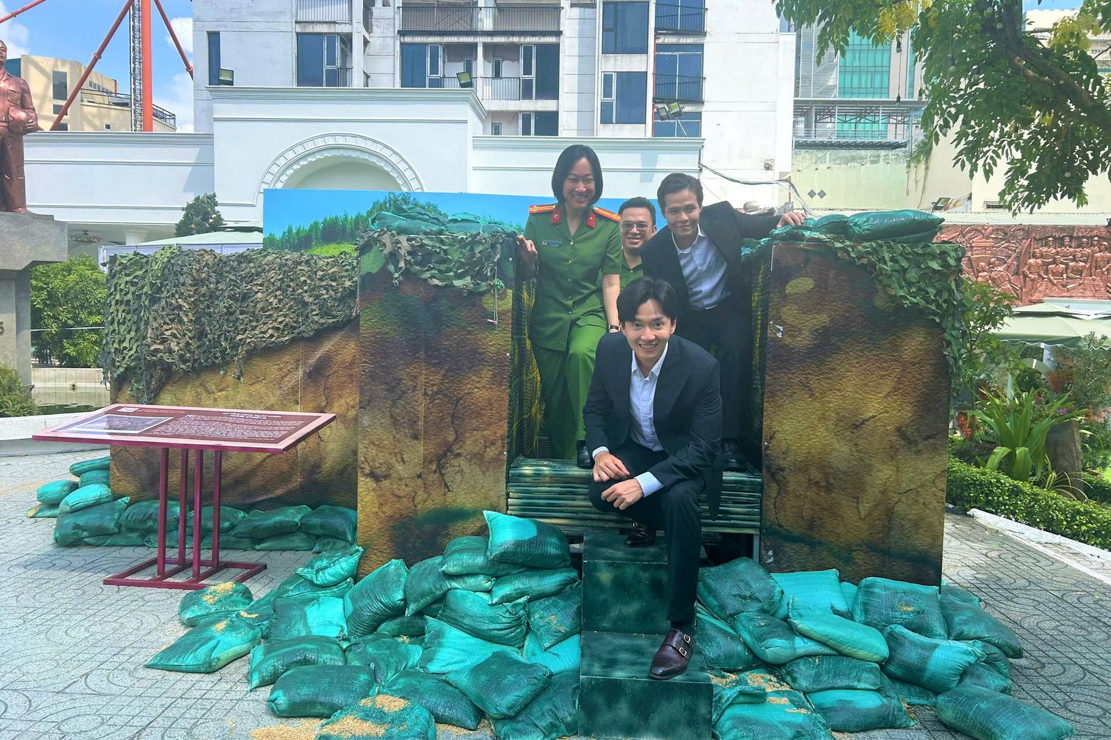Ca sĩ Ngô Kiến Huy cùng các các bộ Công an Thành phố tham gia trải nghiệm khám phá Hầm chữ A và may cờ giải phóng tại bảo tàng. Ảnh: A.X