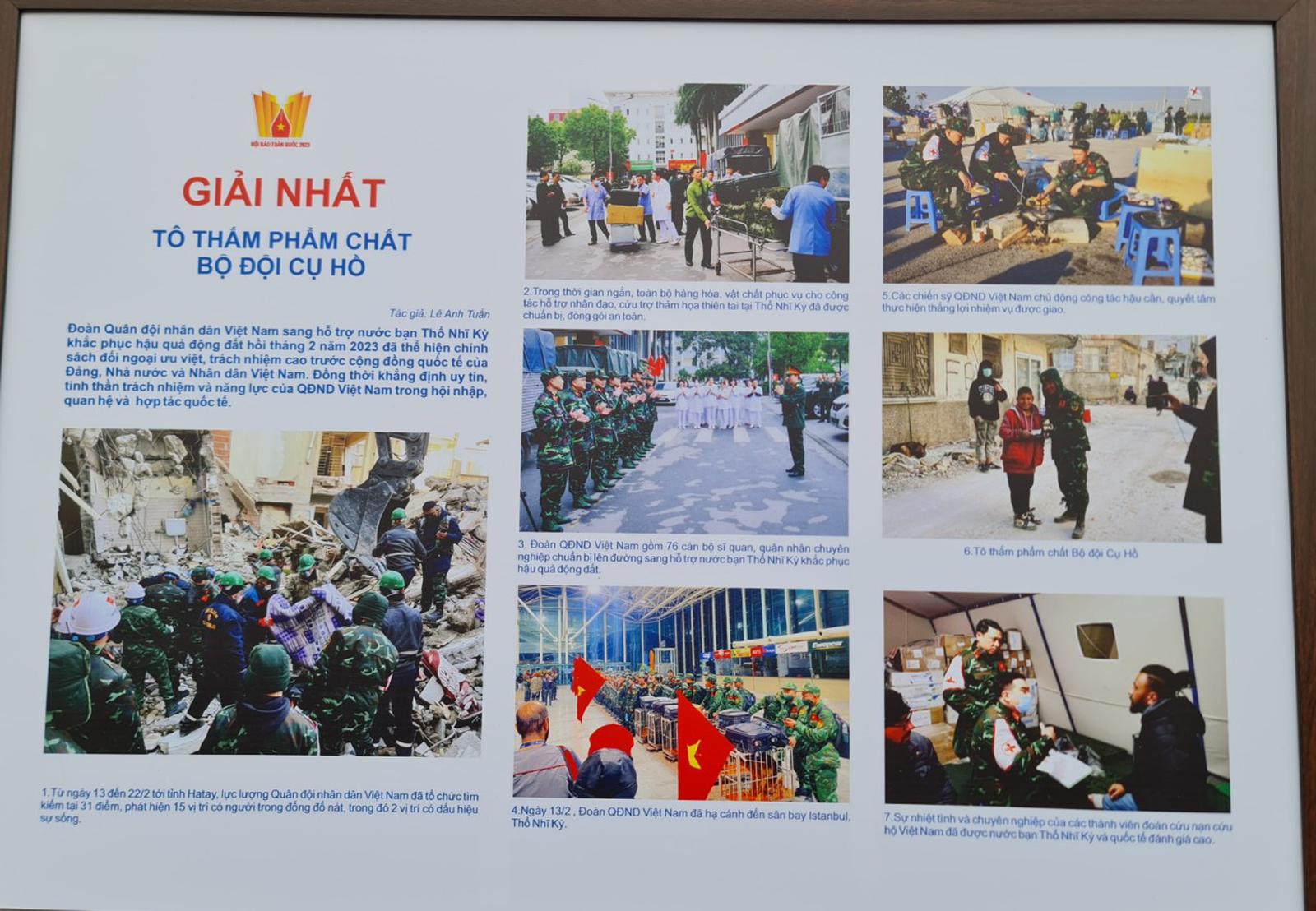 “Chính vì điều này, ảnh bộ "Tô thắm phẩm chất bộ đội Cụ Hồ" của tác giả Lê Anh Tuấn đã thuyết phục tất cả các thành viên trong ban giám khảo và đã đạt giải Nhất của cuộc thi, được đưa ra trưng bày ở triển lãm, bởi bộ ảnh này đáp ứng xuất sắc tiêu chí nói trên” - nhà báo Hà Hồng cho biết.