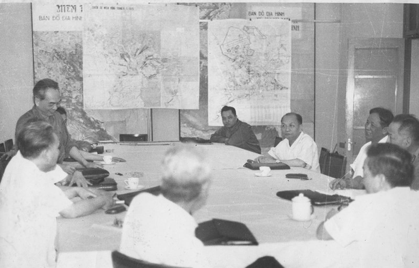 Ngày 14/4/1975, tại Tổng Hành dinh (Nhà D67), Bộ Chính trị quyết định đặt tên chiến dịch Sài Gòn - Gia Định là chiến dịch Hồ Chí Minh. Bên trái, Đại tướng Võ Nguyên Giáp (đang phát biểu). Ảnh tư liệu