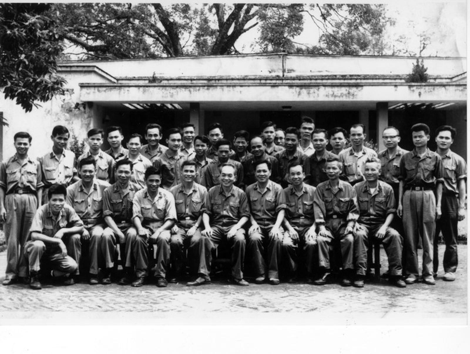 Đại tướng Võ Nguyên Giáp chụp ảnh cùng cán bộ chủ chốt trước nhà Quân ủy Trung ương, ngày 30/4/1975. Ảnh tư liệu