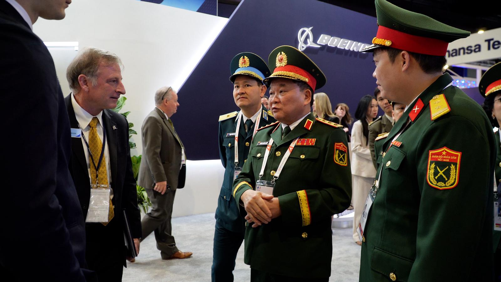 Thượng tướng Hoàng Xuân Chiến và Đoàn Việt Nam tham quan các gian hàng của Tập đoàn Boeing. Ảnh: Kiều Trinh