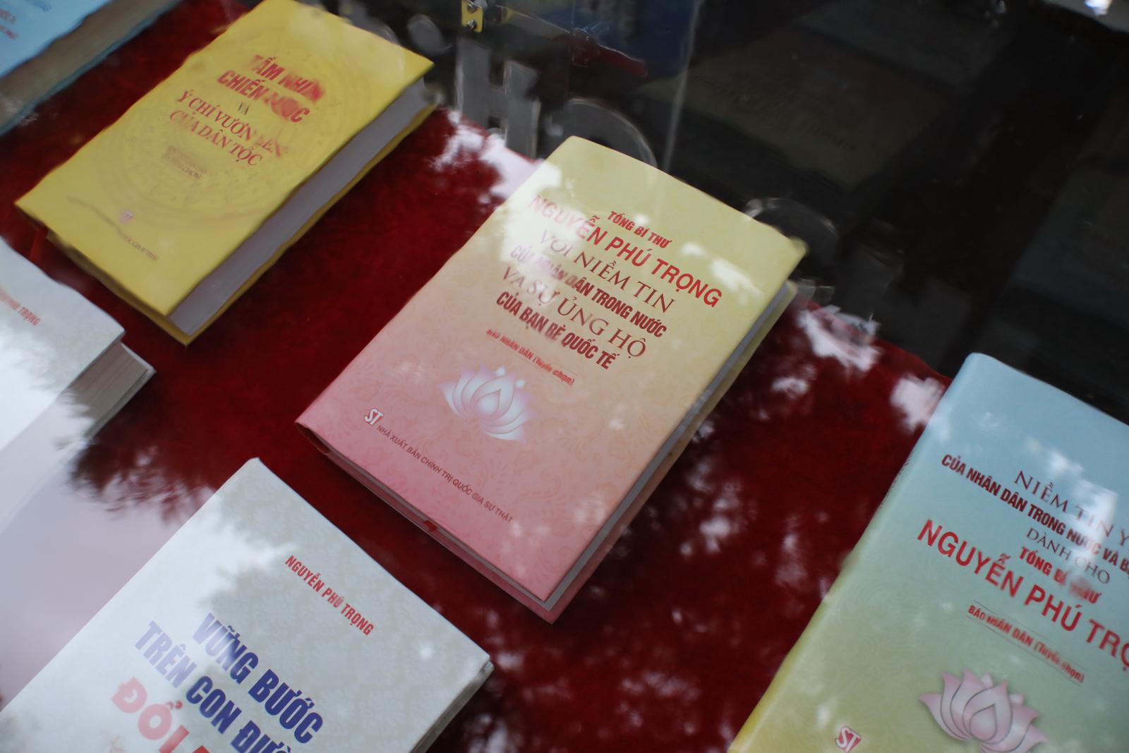 Tủ sách về Tổng Bí thư Nguyễn Phú Trọng trưng bày nhiều ấn phẩm của Tổng Bí thư Nguyễn Phú Trọng có ý nghĩa, tầm quan trọng đặc biệt cả về lý luận và thực tiễn, thể hiện tư tưởng xuyên suốt, nhất quán, kiên định của Đảng Cộng sản Việt Nam về những vấn đề đặc biệt quan trọng như: Về con đường đi lên chủ nghĩa xã hội; về công cuộc đổi mới; về công tác phòng, chống tham nhũng, tiêu cực… Đặc biệt, cuốn sách "Một số vấn đề lý luận và thực tiễn về chủ nghĩa xã hội và con đường đi lên chủ nghĩa xã hội ở Việt Nam" đã được xuất bản bằng 7 ngoại ngữ (tiếng Anh, tiếng Trung Quốc, tiếng Lào, tiếng Nga, tiếng Pháp, tiếng Tây Ban Nha và tiếng Hà Lan), góp phần tuyên truyền quan điểm, chủ trương, đường lối của Đảng và Nhà nước Việt Nam về chủ nghĩa xã hội và con đường đi lên chủ nghĩa xã hội ra thế giới; giúp độc giả trong nước, kiều bào ta ở nước ngoài và bạn bè quốc tế hiểu rõ hơn về đất nước, con người, sự nghiệp đổi mới và phát triển của Việt Nam. Ngoài ra, tủ sách còn có một số cuốn sách viết về tình cảm, niềm tin yêu của nhân dân trong nước và bạn bè quốc tế dành cho Tổng Bí thư Nguyễn Phú Trọng.