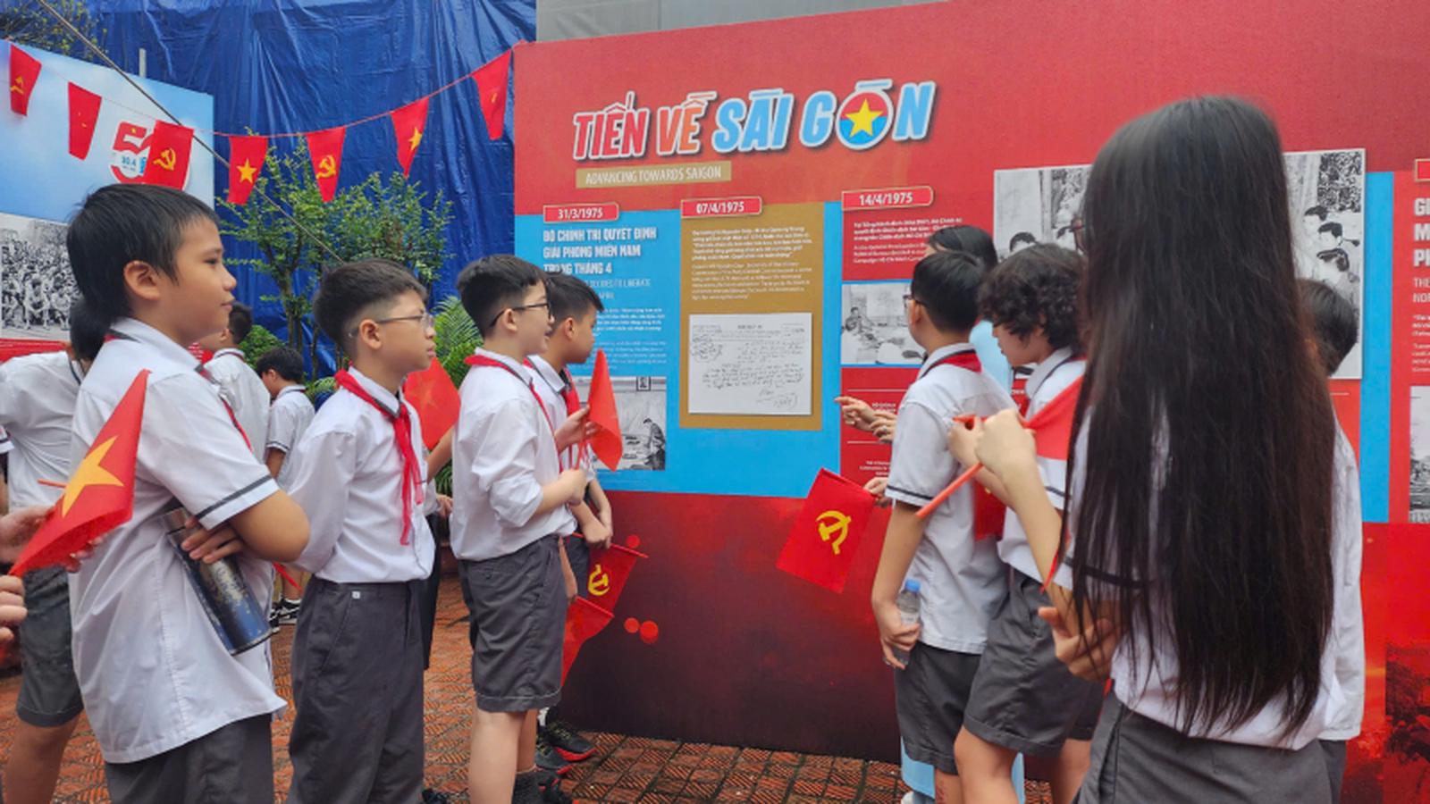 Các cháu học sinh tham quan triển lãm “Con đường thống nhất” tại Hoàng thành Thăng Long. Ảnh: Tuấn Sơn