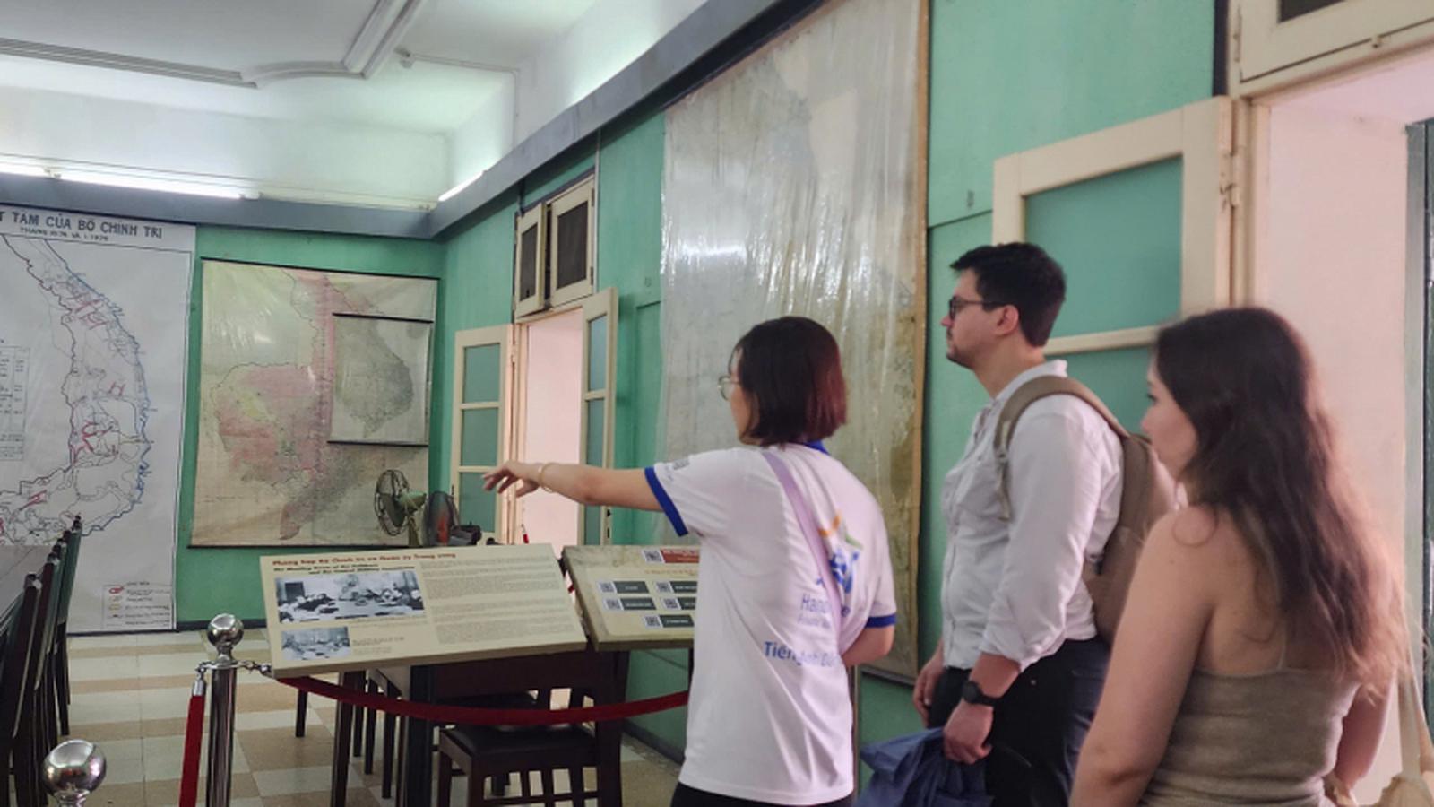 Khách quốc tế tham quan Nhà và Hầm D67 tại triển lãm “Con đường thống nhất” trong Hoàng thành Thăng Long. Ảnh: Tuấn Sơn