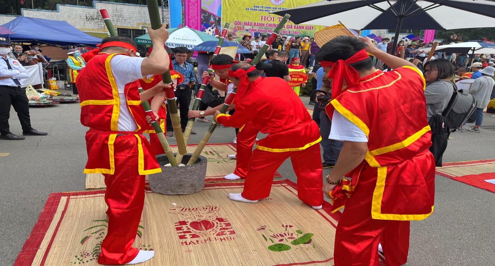 Hội thi gói, nấu bánh chưng và giã bánh giầy tạo nên một bức tranh văn hoá dân gian đa sắc màu trong Lễ Giỗ Tổ Hùng Vương - Lễ hội Đền Hùng năm 2023.