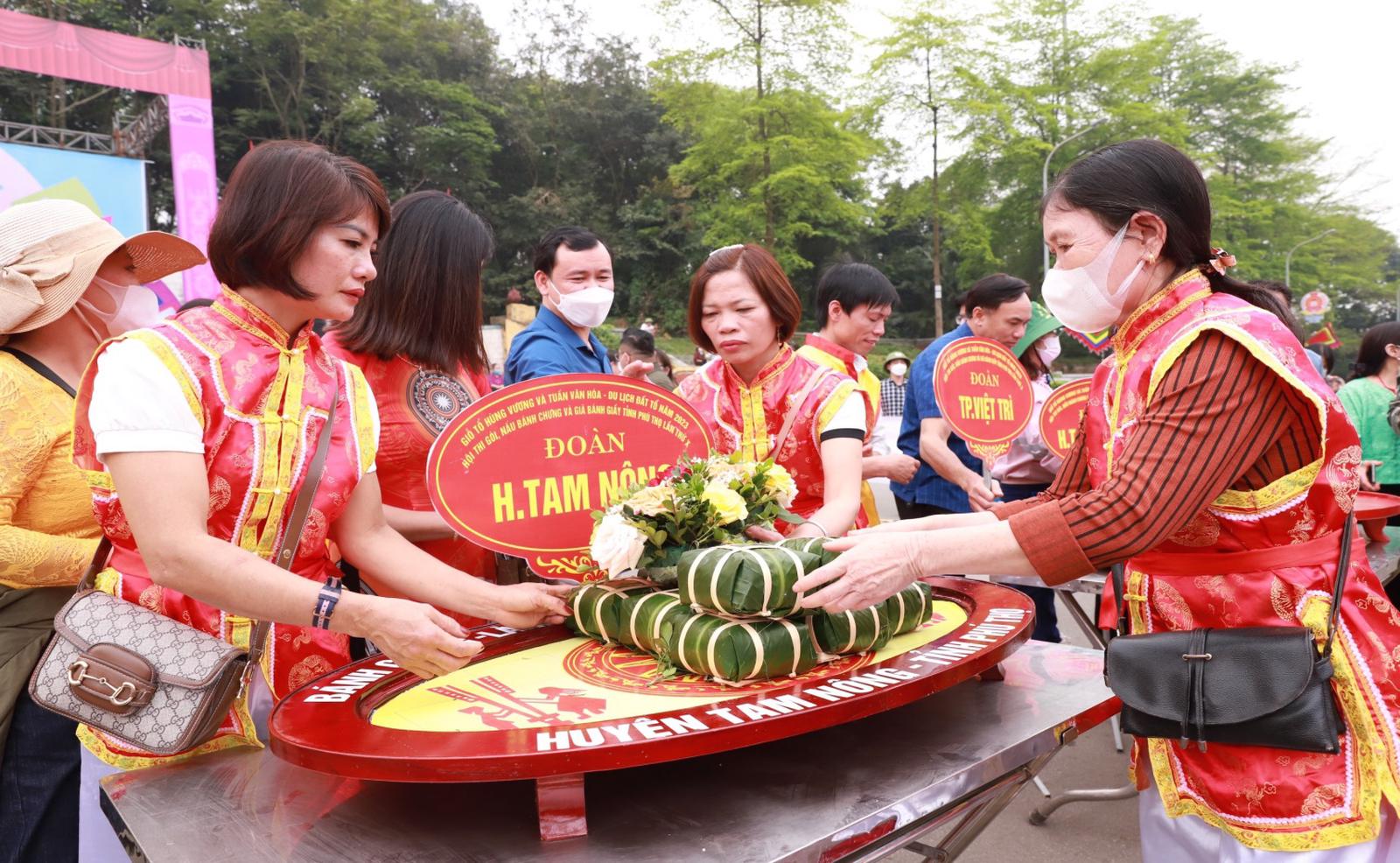 Rất nhiều du khách thập phương và khách nước ngoài cũng hào hứng thưởng thức màn biểu diễn dân gian với hoạt động gói, nấu bánh chưng và giã bánh giầy tại sân trung tâm hành lễ Khu Di tích lịch sử Đền Hùng. Tất cả đều bị thu hút bởi sức hấp dẫn từ các động tác khéo léo, nhanh nhẹn, khoẻ mạnh và không khí sôi động do các nghệ nhân gói bánh chưng và giã bánh giầy đem lại.