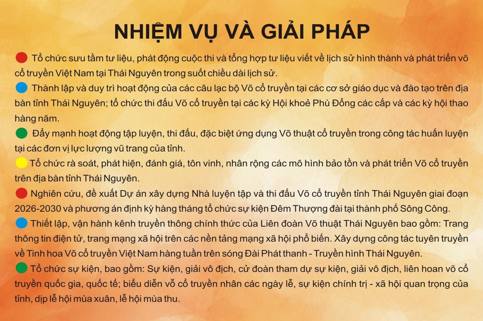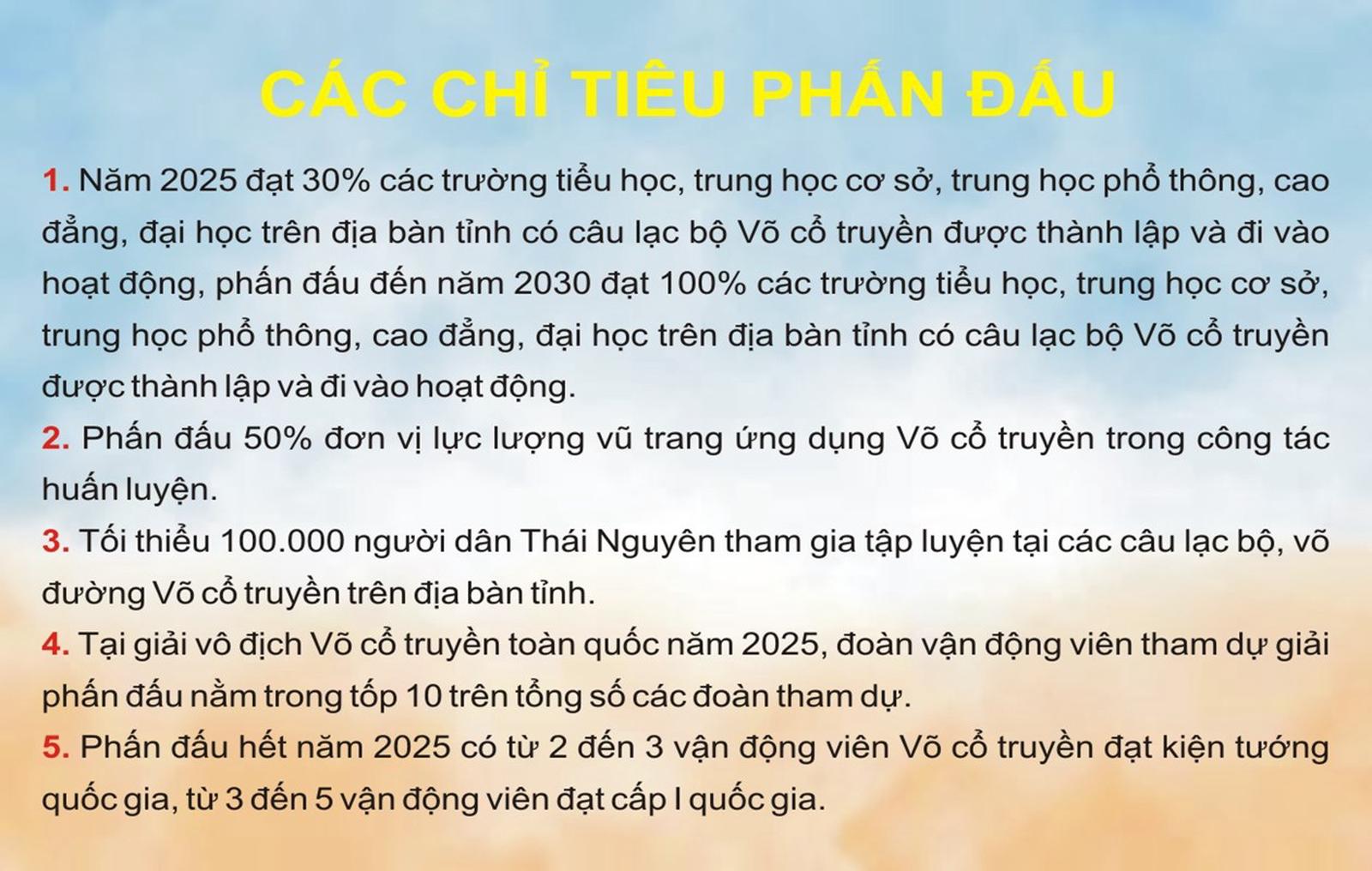 Để tận dụng các cơ hội đang có, UBND tỉnh đã ban hành Kế hoạch phát triển Võ cổ truyền Việt Nam năm 2025 trên địa bàn tỉnh Thái Nguyên, Kế hoạch cụ thể hoá các chỉ tiêu cần đạt được, gồm: