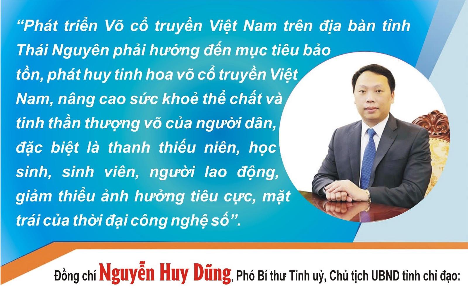 Tại buổi làm việc với lãnh đạo Sở Văn hoá, Thể thao và Du lịch tỉnh Thái Nguyên, đồng chí Nguyễn Huy Dũng, Phó Bí thư Tỉnh uỷ, Chủ tịch UBND tỉnh đã giao cho Sở Văn hoá, Thể thao và Du lịch là đầu mối, phối hợp với các sở, ban, ngành, đơn vị, địa phương tham mưu xây dựng cho UBND tỉnh ban hành kế hoạch phát triển Võ cổ truyền Việt Nam trên địa bàn tỉnh Thái Nguyên năm 2025.