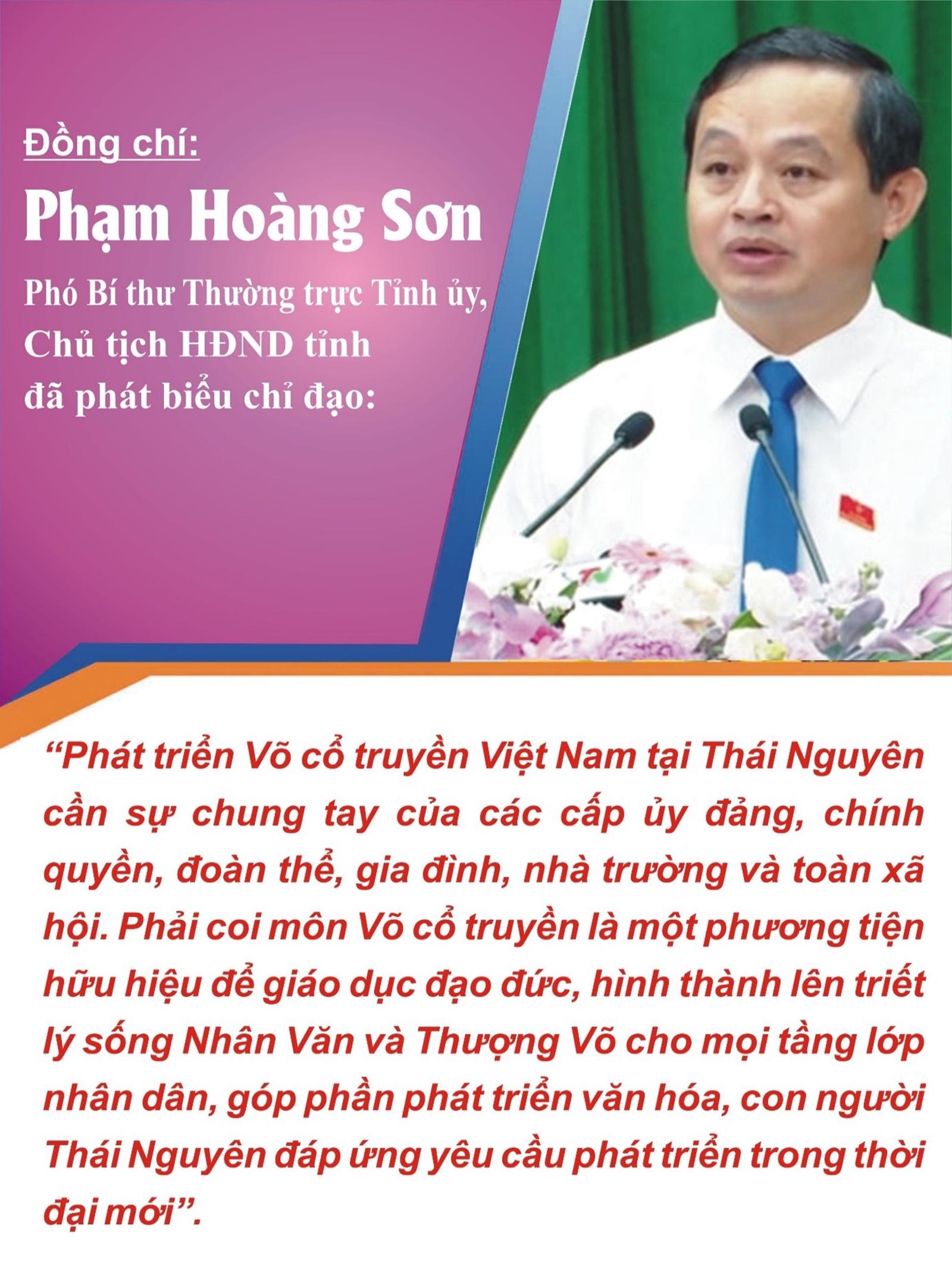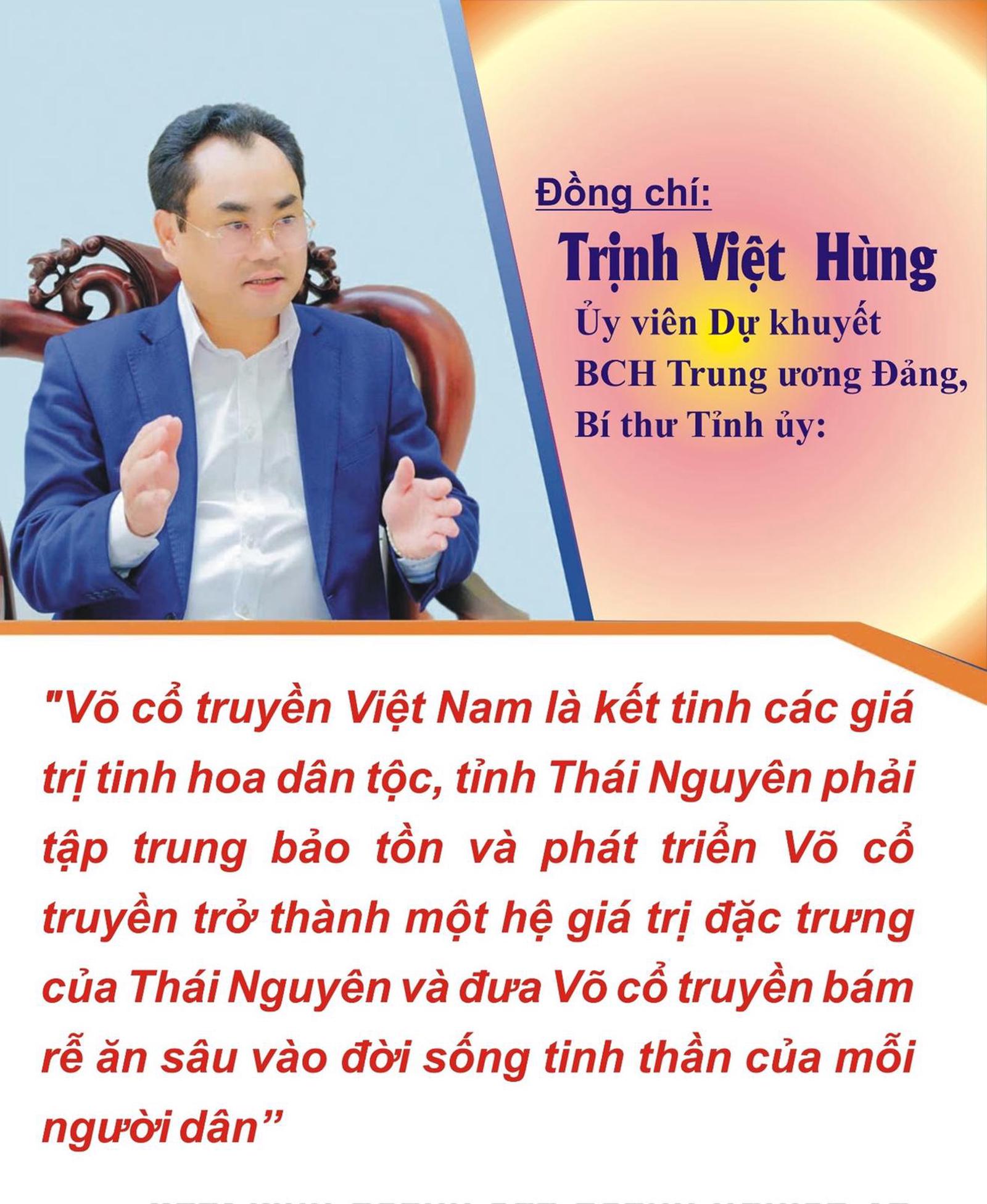 Tại Hội nghị Ban Thường vụ Tỉnh uỷ (Tháng 02/2024), đồng chí Trịnh Việt Hùng, Uỷ viên Dự khuyết Ban Chấp hành Trung ương Đảng, Bí thư Tỉnh uỷ tỉnh Thái Nguyên đã quyết liệt chỉ đạo toàn Đảng bộ, Chính quyền và Nhân dân trong tỉnh tập trung phát triển thể dục thể thao nhằm nâng cao sức khoẻ cho người dân, đặc biệt xây dựng các chương trình, kế hoạch bảo tồn và phát triển Võ cổ truyền Việt Nam trên địa bàn tỉnh Thái Nguyên.