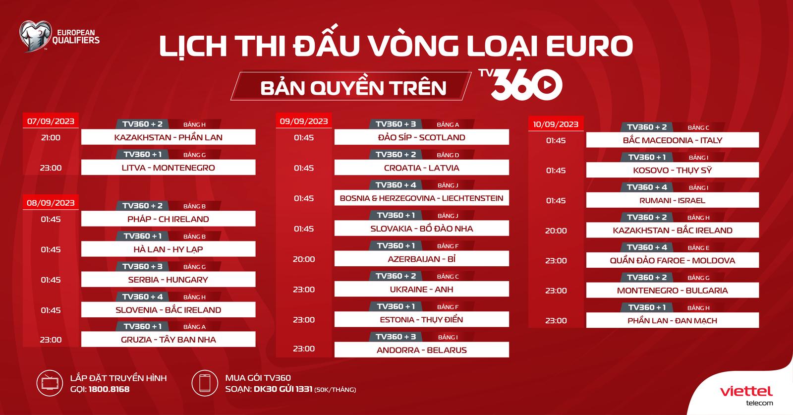 (Thanh tra) - Từ ngày 7/9/2023, TV360 Viettel - đơn vị sở hữu bản quyền vòng loại Euro 2024, sẽ phát sóng trực tiếp miễn phí trên hệ thống truyền hình TV360. Khán giả truy cập http://tv360.vn hoặc ứng dụng TV360 và đăng nhập tài khoản, sẽ được xem miễn phí trọn vẹn vòng loại Euro 2024.