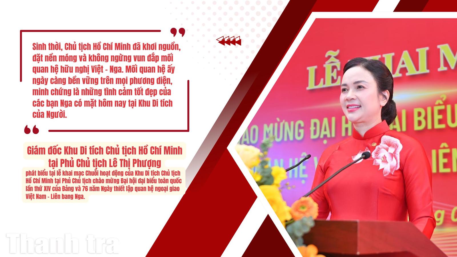 (Thanh tra) - Hướng tới Đại hội đại biểu toàn quốc lần thứ XIV của Đảng Cộng sản Việt Nam và kỷ niệm 76 năm thiết lập quan hệ ngoại giao Việt Nam – Liên bang Nga, Khu Di tích Chủ tịch Hồ Chí Minh tại Phủ Chủ tịch phối hợp cùng Đại sứ quán Liên bang Nga tổ chức chuỗi hoạt động chính trị – văn hóa đặc biệt. Sự kiện không chỉ tôn vinh những trang sử vàng của dân tộc mà còn khẳng định giá trị trường tồn của di sản Hồ Chí Minh trong việc gắn kết tình hữu nghị quốc tế bền vững.