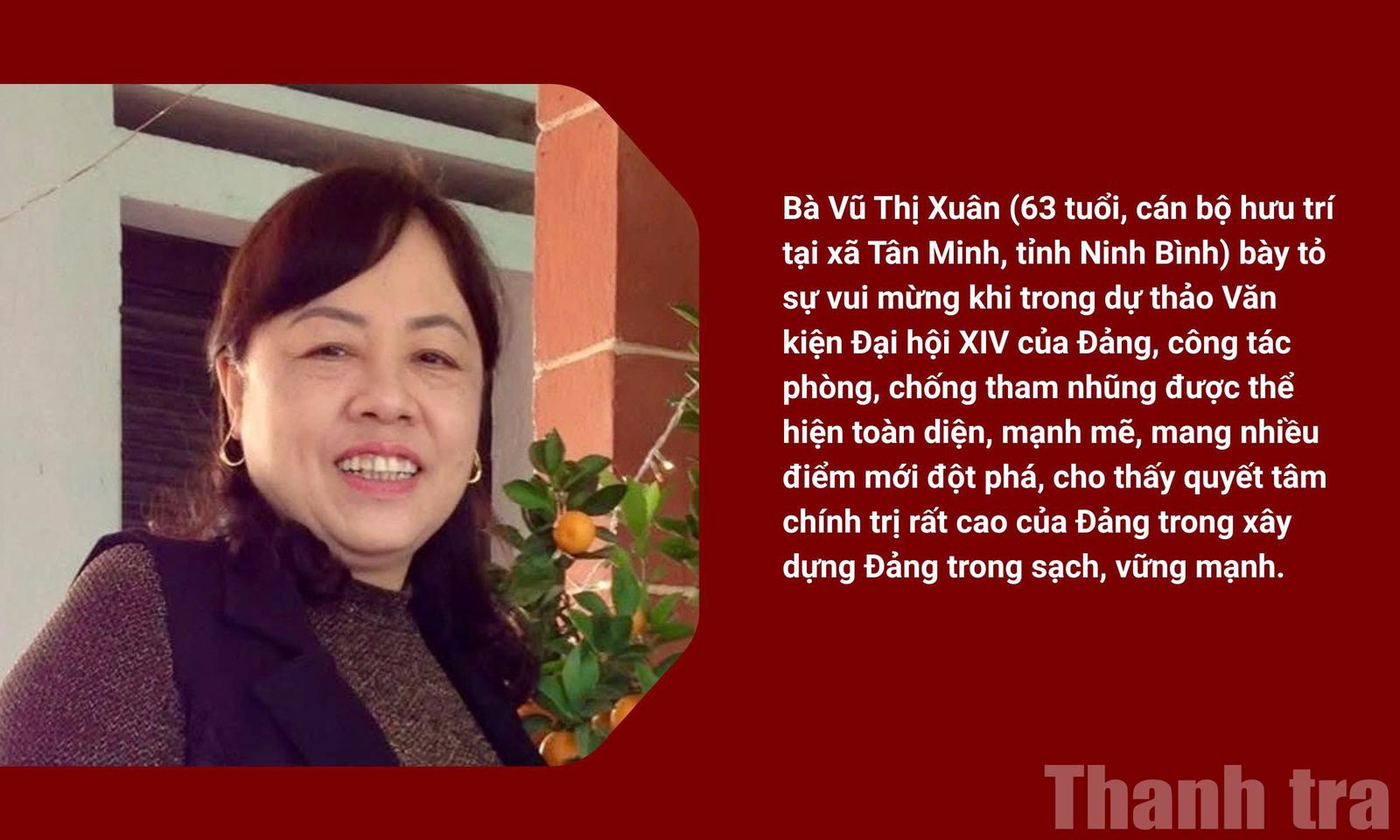 Bà Vũ Thị Xuân (63 tuổi, cán bộ hưu trí tại xã Tân Minh, tỉnh Ninh Bình) chia sẻ: Tôi thấy dự thảo Văn kiện đã có bước tiến lớn trong tư duy khi xác định đổi mới mạnh mẽ phương pháp công tác kiểm tra, giám sát của Đảng, gắn kiểm tra, giám sát với các phương thức kiểm soát quyền lực khác.