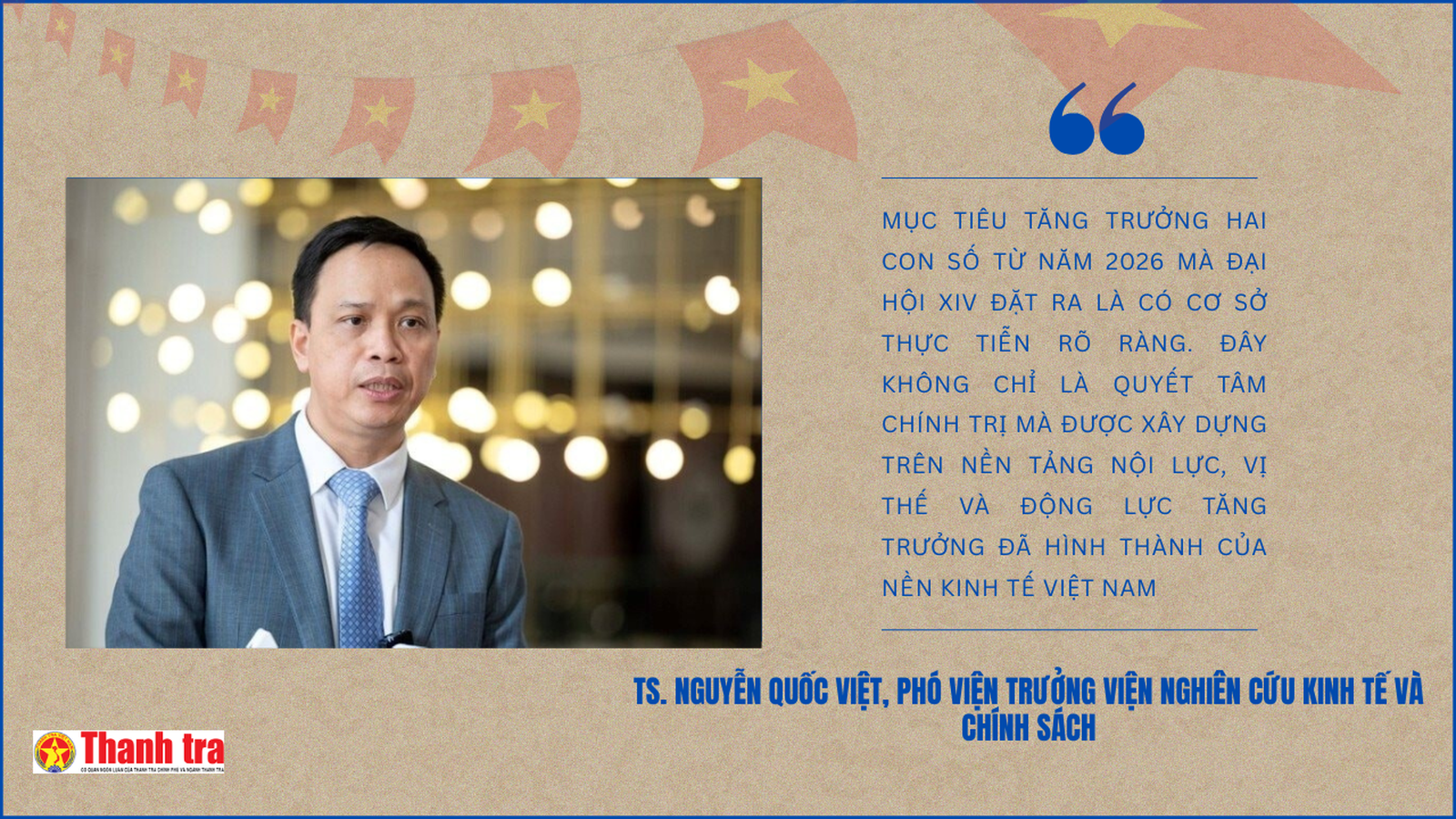 "Tất nhiên, đây là quyết tâm chính trị rất cao của Đảng, Nhà nước và toàn xã hội. Tuy nhiên, quyết tâm này không phải là mong muốn chủ quan mà có những cơ sở thực chất từ nền tảng phát triển của kinh tế Việt Nam trong thời gian qua", TS. Nguyễn Quốc Việt nhấn mạnh.