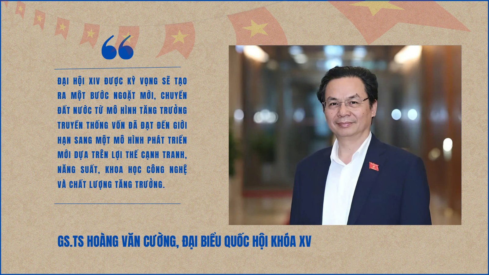 "Đại hội XIV được kỳ vọng sẽ tạo ra một bước ngoặt mới, chuyển đất nước từ mô hình tăng trưởng truyền thống vốn đã đạt đến giới hạn sang một mô hình phát triển mới dựa trên lợi thế cạnh tranh, năng suất, khoa học - công nghệ và chất lượng tăng trưởng", GS.TS Hoàng Văn Cường nhấn mạnh.