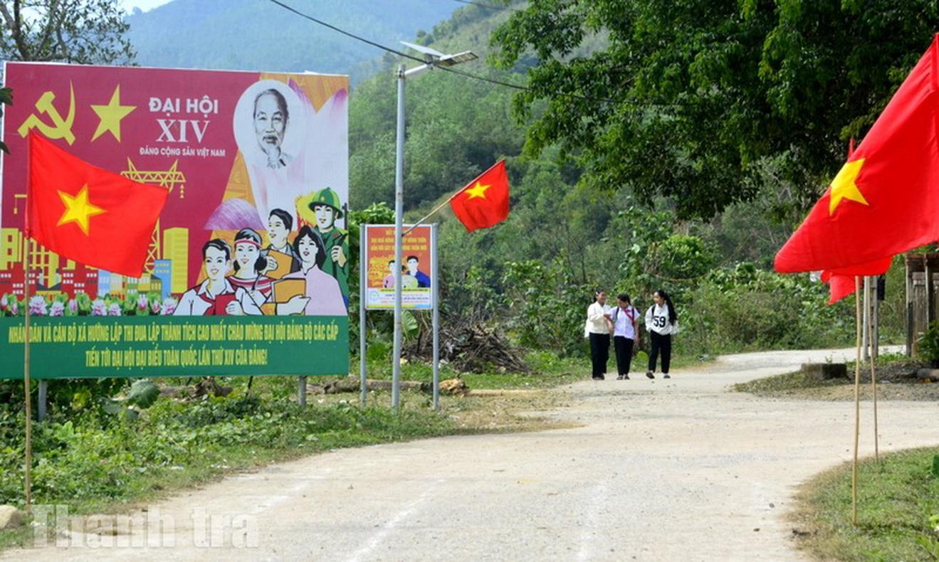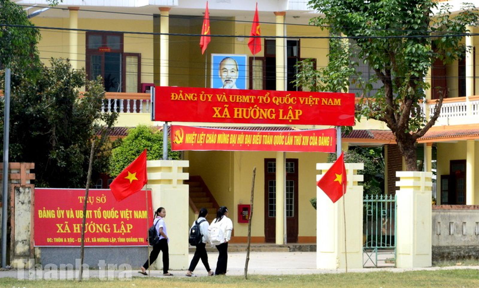 Cờ Đảng, cờ Tổ quốc được treo trang trọng tại trung tâm xã Hướng Lập, tạo không khí hướng về Đại hội XIV của Đảng. Ảnh: Minh Tân