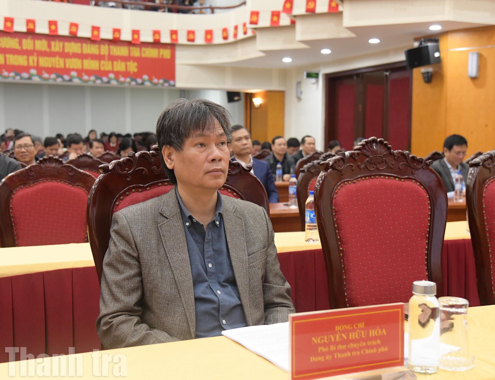 Ở điểm cầu Thanh tra Chính phủ có ông Nguyễn Hữu Hòa, Phó Bí thư Đảng ủy Thanh tra Chính phủ; các Ủy viên Ban Thường vụ Đảng ủy, Ủy viên Ban Chấp hành Đảng bộ Thanh tra Chính phủ; Ủy viên Ủy ban Kiểm tra Đảng ủy; cấp ủy các đảng bộ, chi bộ trực thuộc Đảng bộ Thanh tra Chính phủ; cấp ủy các chi bộ trực thuộc Đảng bộ cơ sở; công chức chuyên trách, kiêm nhiệm các cơ quan tham mưu, giúp việc Đảng ủy.