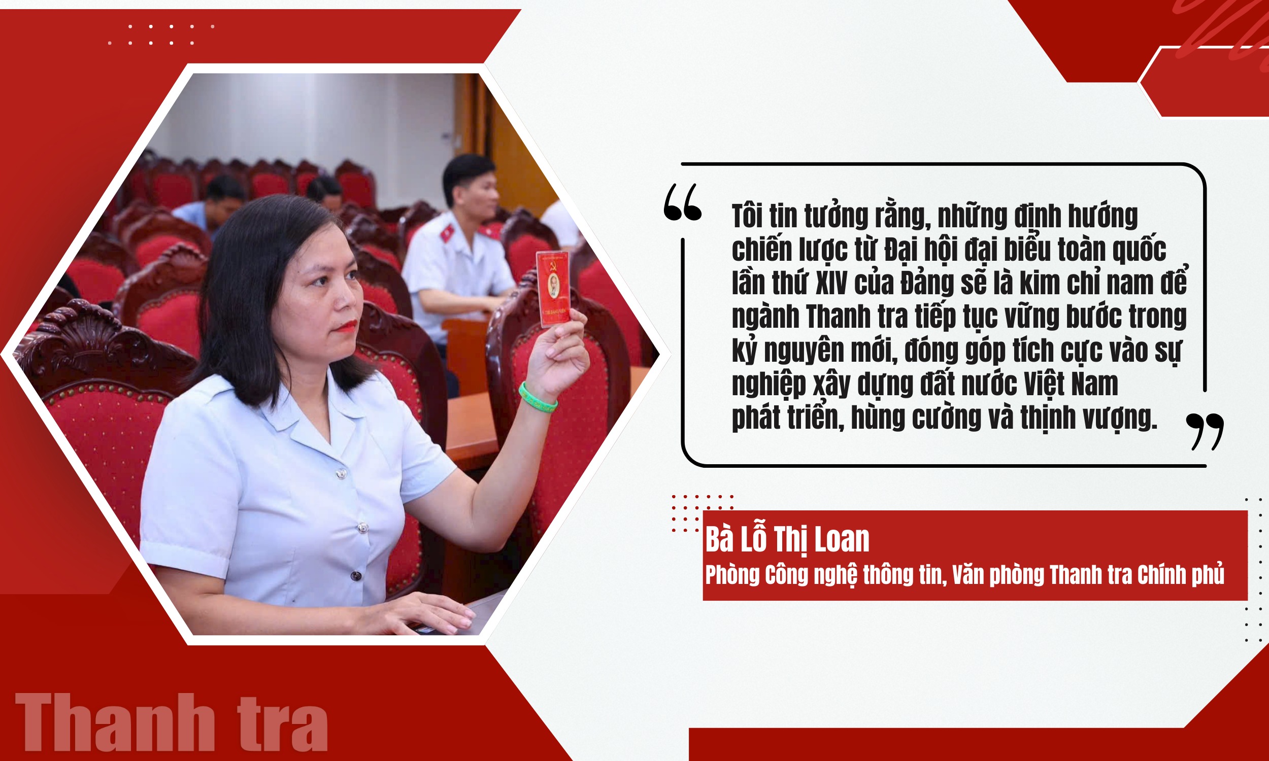 Bà Lỗ Thị Loan, Phòng Công nghệ thông tin, Văn phòng Thanh tra Chính phủ cho biết, là một đảng viên sinh hoạt tại Đảng bộ Văn phòng Thanh tra Chính phủ, bà nhận thức sâu sắc rằng Đại hội XIV của Đảng là sự kiện chính trị đặc biệt quan trọng, có ý nghĩa chiến lược đối với sự phát triển của đất nước và định hướng lâu dài cho mọi lĩnh vực công tác, trong đó có công tác thanh tra.