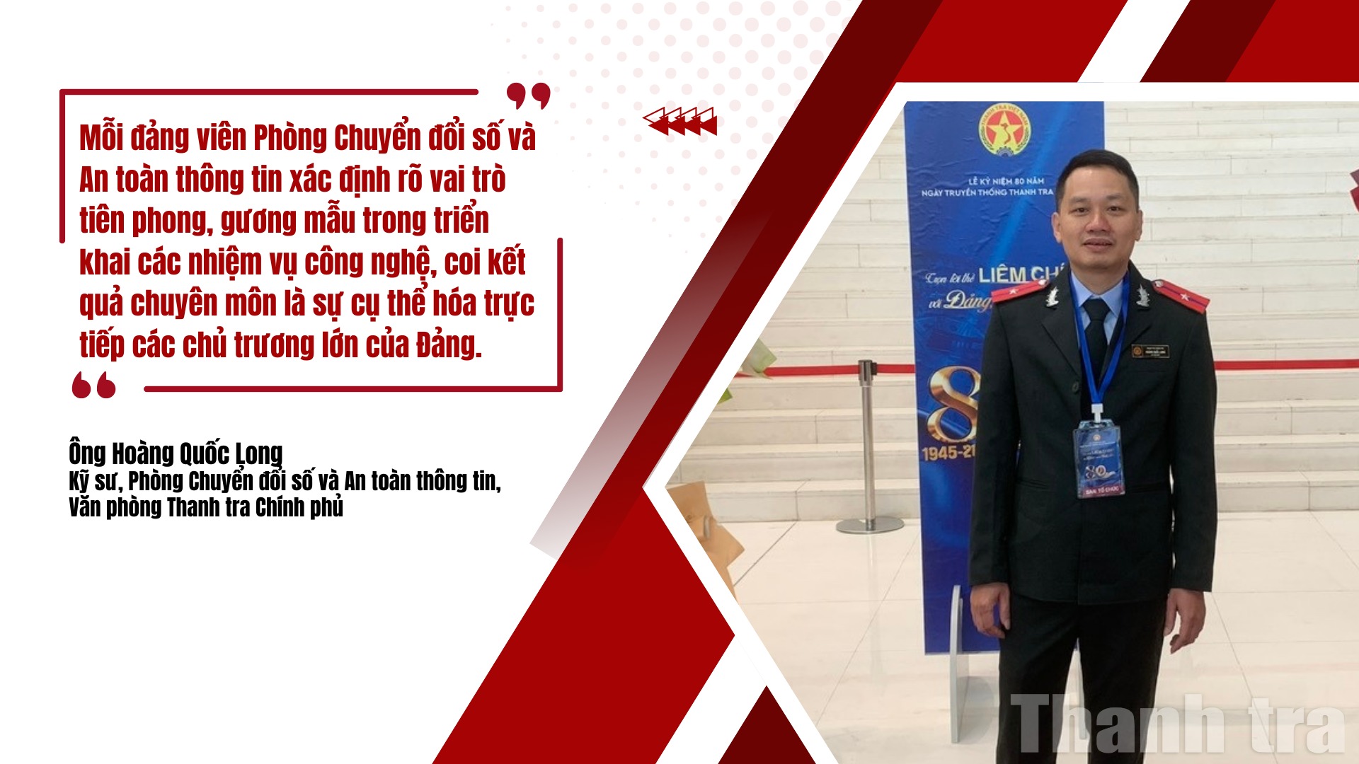 Trong thời điểm Đại hội XIV của Đảng đang diễn ra, ông Hoàng Quốc Long khẳng định, bản thân ông cũng như mỗi đảng viên Phòng Chuyển đổi số và An toàn thông tin xác định rõ vai trò tiên phong, gương mẫu trong triển khai các nhiệm vụ công nghệ, coi kết quả chuyên môn là sự cụ thể hóa trực tiếp các chủ trương lớn của Đảng.