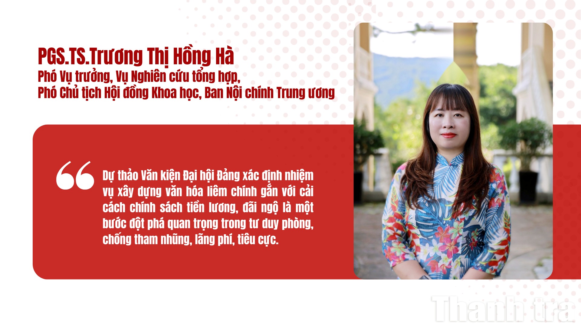 Theo PGS.TS Trương Thị Hồng Hà, Phó Vụ trưởng, Vụ Nghiên cứu tổng hợp, Phó Chủ tịch Hội đồng Khoa học, Ban Nội chính Trung ương, Dự thảo Văn kiện Đại hội XIV Đảng xác định nhiệm vụ xây dựng văn hóa liêm chính gắn với cải cách chính sách tiền lương, đãi ngộ là một bước đột phá quan trọng trong tư duy phòng, chống tham nhũng, lãng phí, tiêu cực.