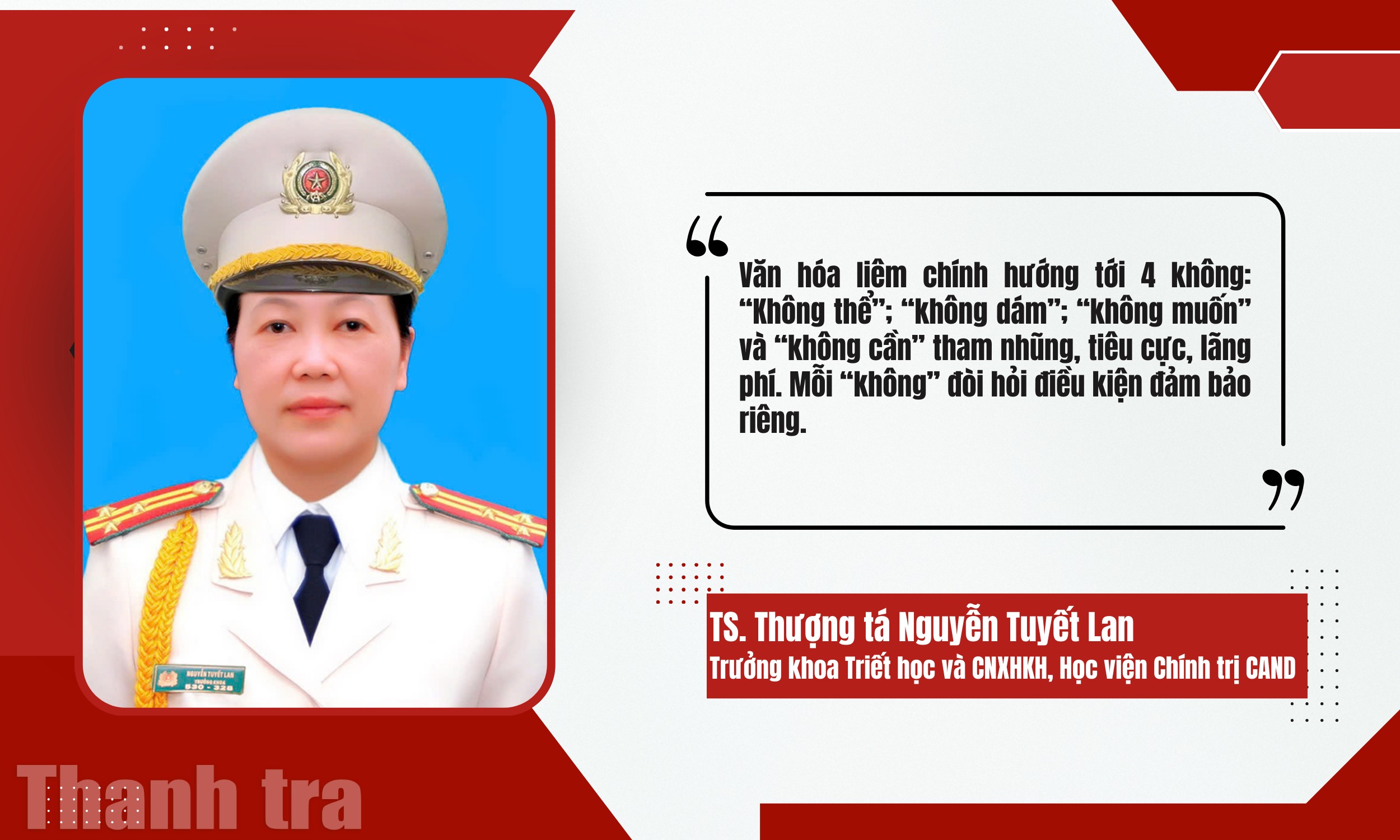 TS.Thượng tá Nguyễn Tuyết Lan, Trưởng khoa Triết học và CNXHKH, Học viện Chính trị CAND nhấn mạnh, văn hóa liêm chính được hiểu là một hệ thống các giá trị, chuẩn mực đạo đức và hành vi ứng xử nhằm ngăn chặn tham nhũng từ gốc rễ, lấy sự trung thực và trách nhiệm làm giá trị cốt lõi.
