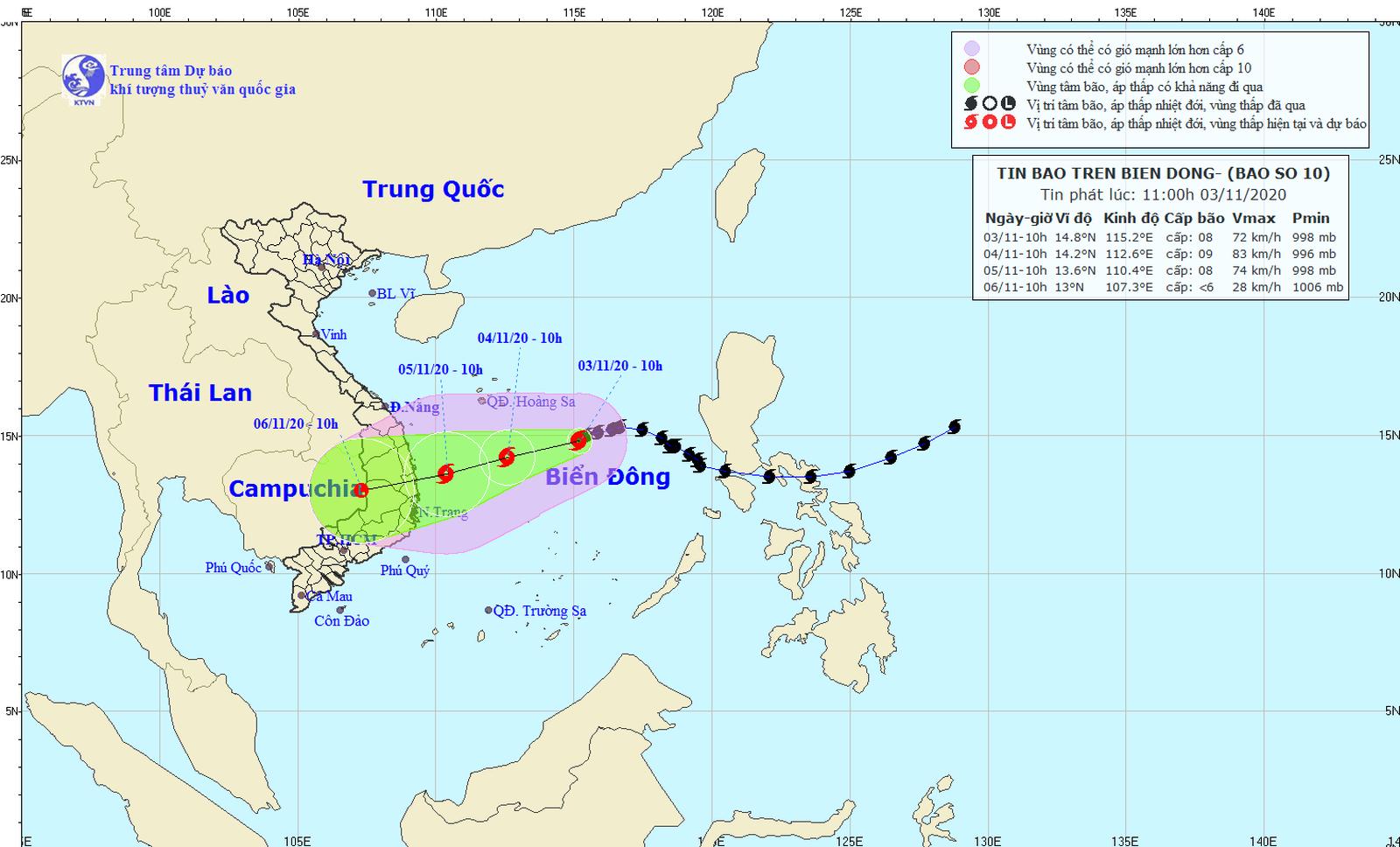 Ông Khiêm cho biết, lúc 11 giờ ngày 3/11, bão số 10 vẫn giữ cường độ gió cấp 8 và đang có xu hướng tăng cấp, cách quần đảo Hoàng Sa khoảng 380km về phía Đông Đông Nam, di chuyển theo hướng về phía đất liền các tỉnh, thành phố từ Đà Nẵng đến Khánh Hòa.