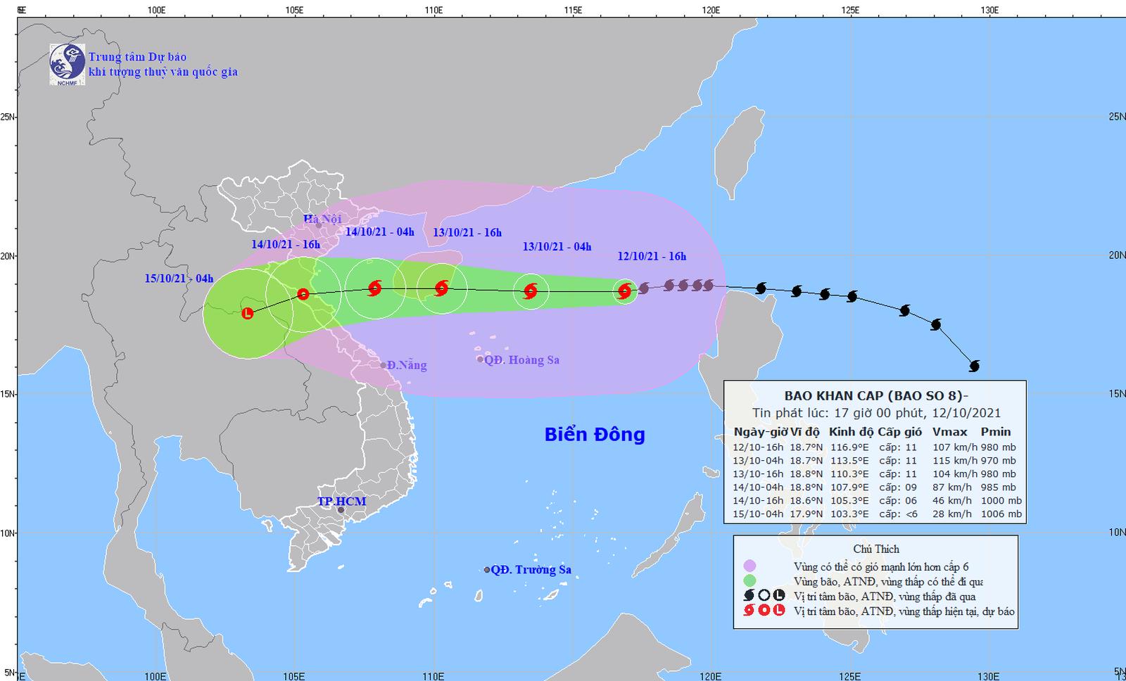 Đường đi của bão số 8 lúc 16h chiều ngày 12/10. Ảnh: Trung tâm Dự báo KTTV Quốc gia