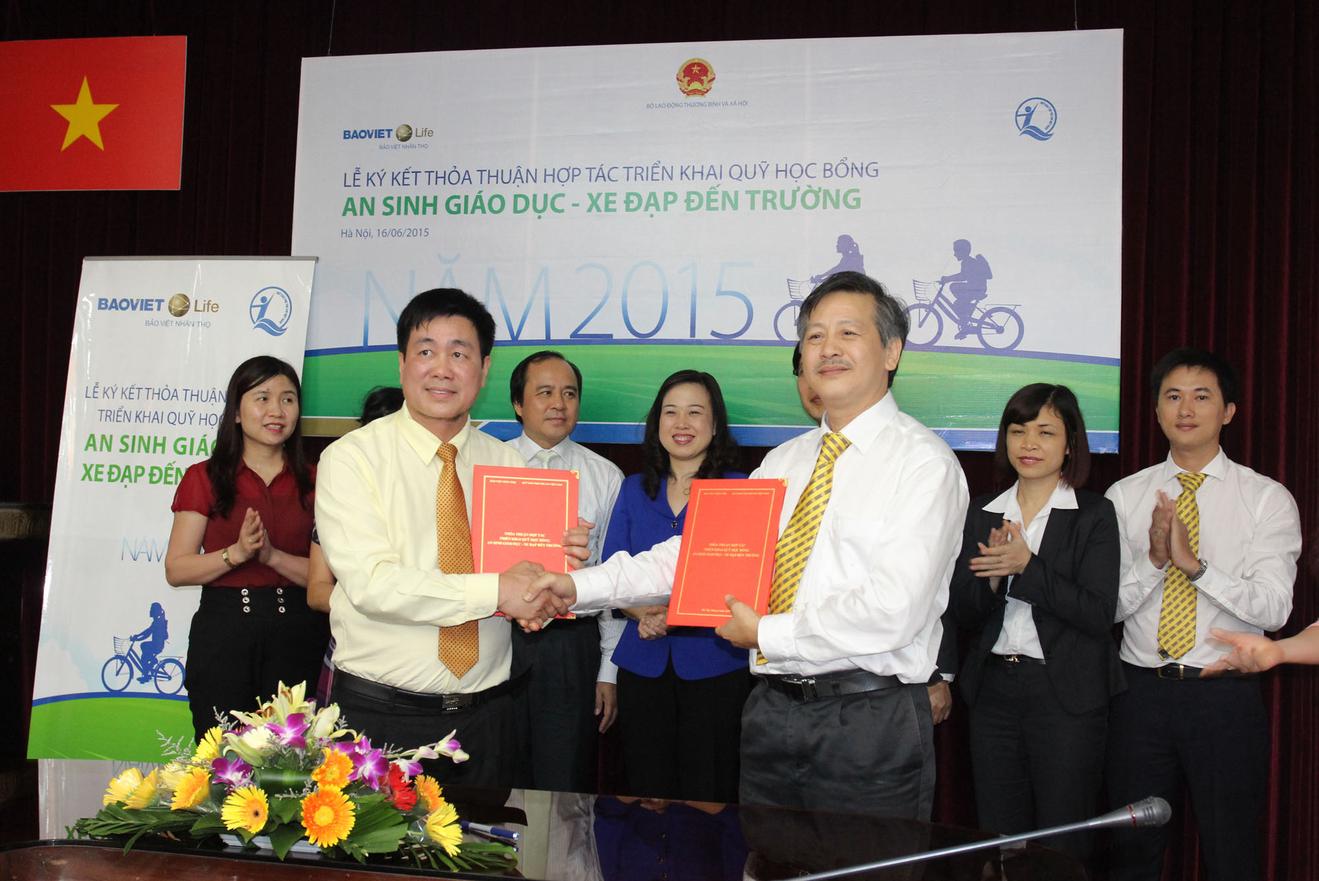 Ngày 16/6, tại trụ sở Bộ Lao động – Thương binh và Xã hội, Tổng Công ty Bảo Việt Nhân thọ (BVNT) cùng Quỹ Bảo trợ Trẻ em Việt Nam (BTTEVN) ký kết thỏa thuận hợp tác“Học bổng An Sinh Giáo Dục – Xe đạp đến trường 2015” trao 1.200 xe đạp cho trẻ em nghèo hiếu học với tổng trị giá hơn 2.310.000 (Hai tỷ ba trăm mười triệu đồng).