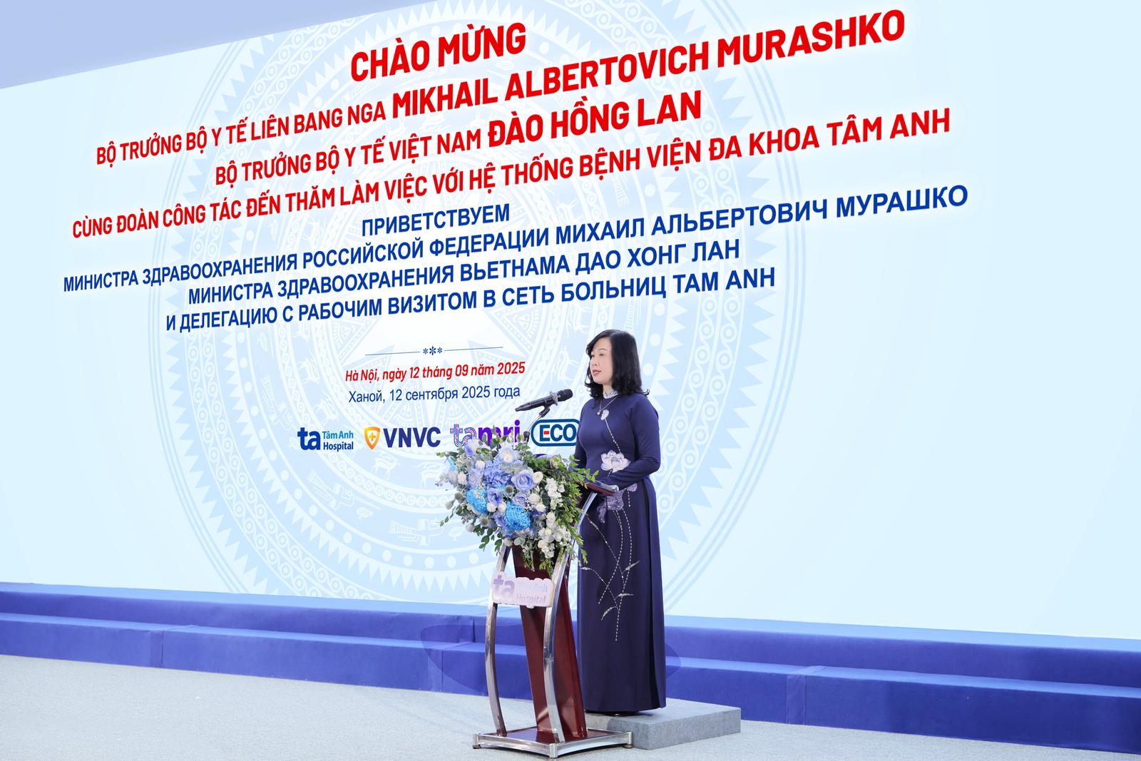 Bộ trưởng Bộ Y tế Đào Hồng Lan khẳng định hoạt động thăm, làm việc và chứng kiến Lễ ký kết giữa Hệ thống Bệnh viện Đa khoa Tâm Anh và các đối tác y tế của Liên bang Nga là minh chứng cụ thể, thiết thực cho hợp tác ngày càng sâu rộng và hiệu quả giữa cơ sở y tế và doanh nghiệp của hai nước. Ảnh: BVĐK Tâm Anh