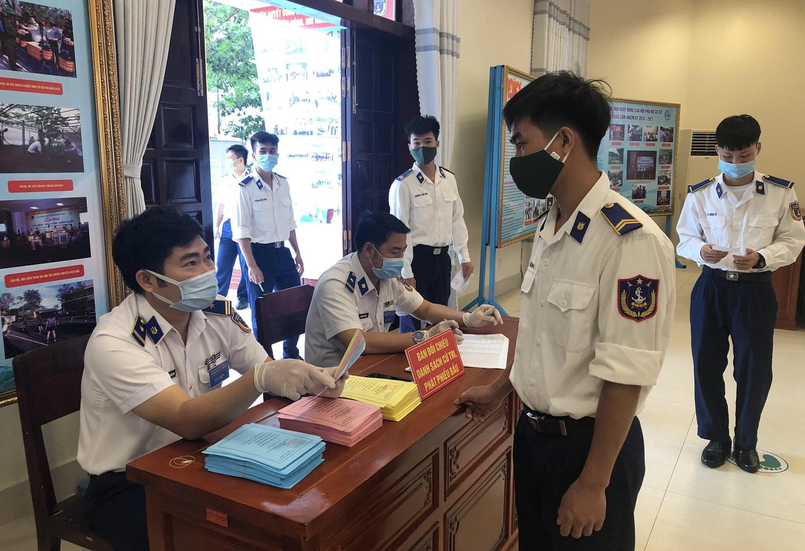 Cán bộ, chiến sĩ Vùng Cảnh sát biển 3 làm thủ tục để bỏ phiếu bầu cử