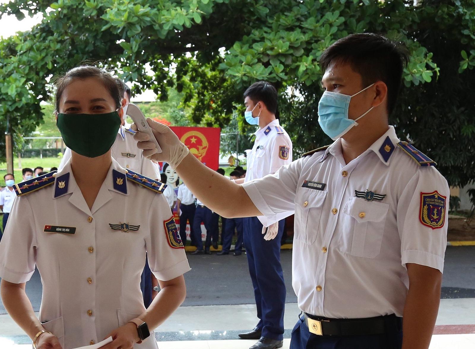 Cán bộ, chiến sĩ được đo thân nhiệt trước khi tiến hành vào bỏ phiếu bầu cử