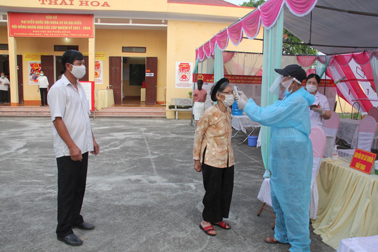Cử tri tại khu vực bầu cử phường Hòa Mạc, thị xã Duy Tiên được đo thân nhiệt trước khi tham gia bầu cử (Ảnh: CTTĐT Hà Nam)