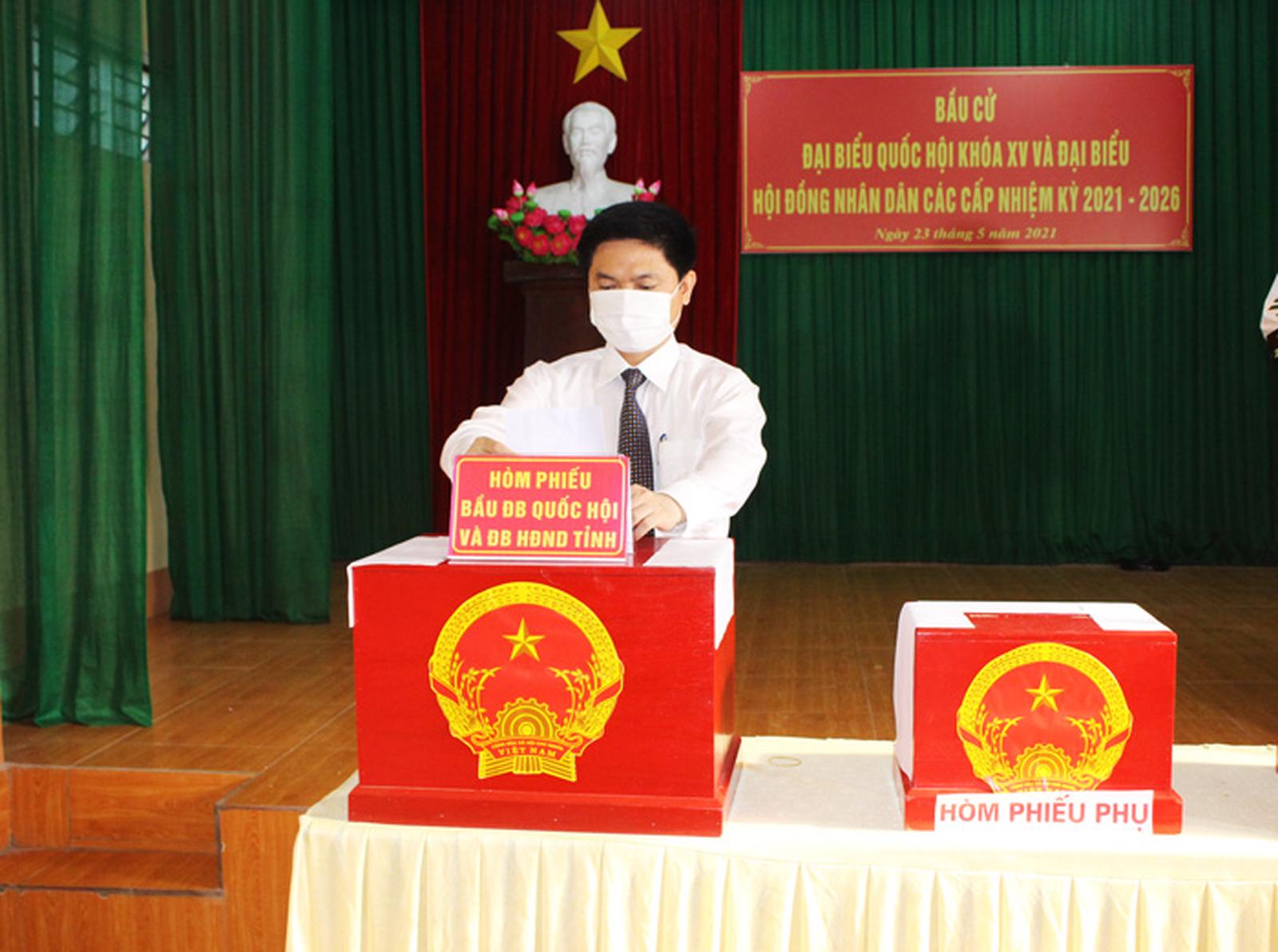 Chủ tịch UBND tỉnh Trương Quốc Huy bỏ phiếu thực hiện quyền công dân tại khu vực bỏ phiếu số 2, tổ dân phố Thái Hòa, phường Hòa Mạc, thị xã Duy Tiên (Ảnh: CTTĐT Hà Nam)