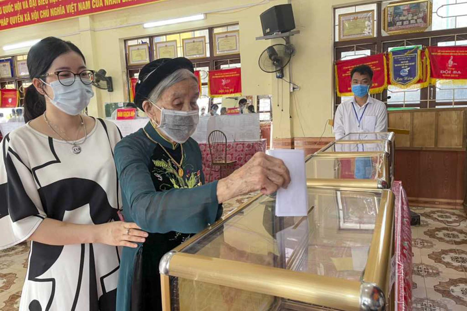 Mẹ Việt Nam Anh hùng Hoàng Thị Lại, 96 tuổi, khu 10, phường Hoành Bồ (TP Hạ Long) thực hiện lần bỏ phiếu thứ 15 bầu ĐBQH và HĐND các cấp. Ảnh: TTTT