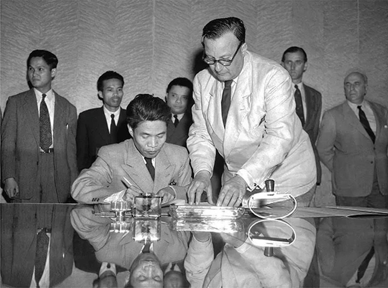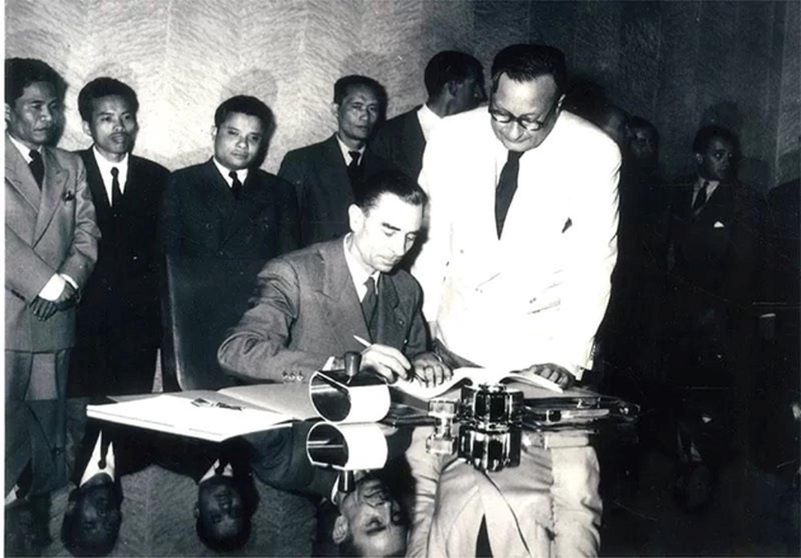 Thứ trưởng Bộ Quốc phòng Tạ Quang Bửu thay mặt Chính phủ và Bộ Tổng tư lệnh Quân đội Nhân dân Việt Nam ký Hiệp định đình chỉ chiến sự ở Việt Nam ngày 21/7/1954. Ảnh tư liệu