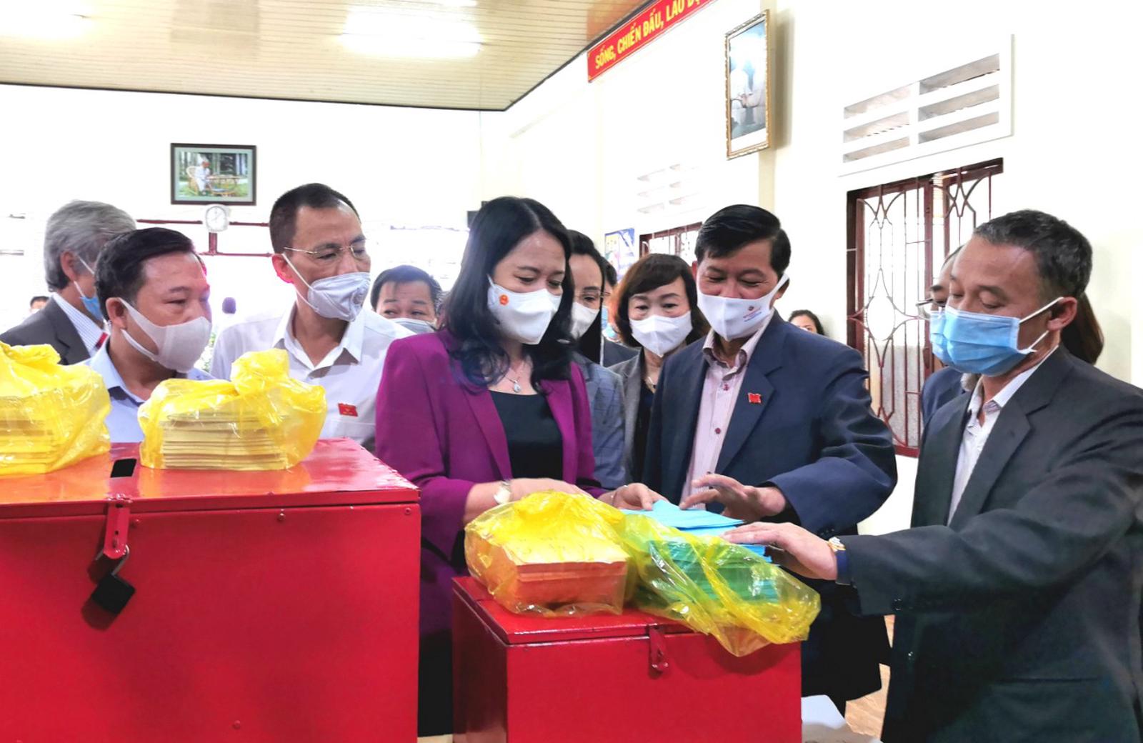 Phó Chủ tịch nước Võ Thị Ánh Xuân kiểm tra thùng phiếu và phiếu bầu tại phường 9, TP Đà Lạt. Ảnh: Thanh Chương
