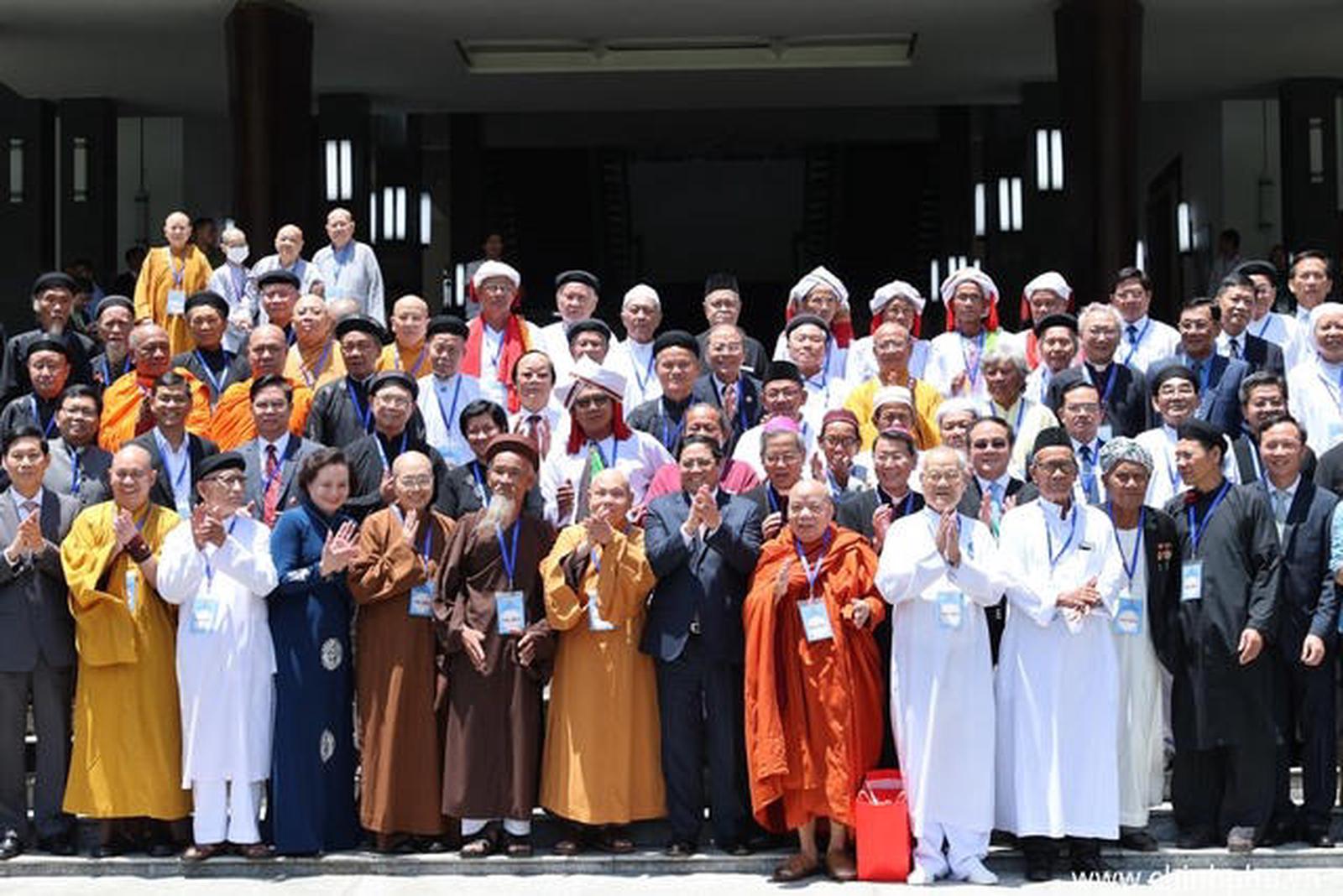 Thủ tướng Phạm Minh Chính chụp ảnh lưu niệm với các chức sắc và đại diện các tổ chức tôn giáo tham dự hội nghị. Ảnh: VGP/Nhật Bắc