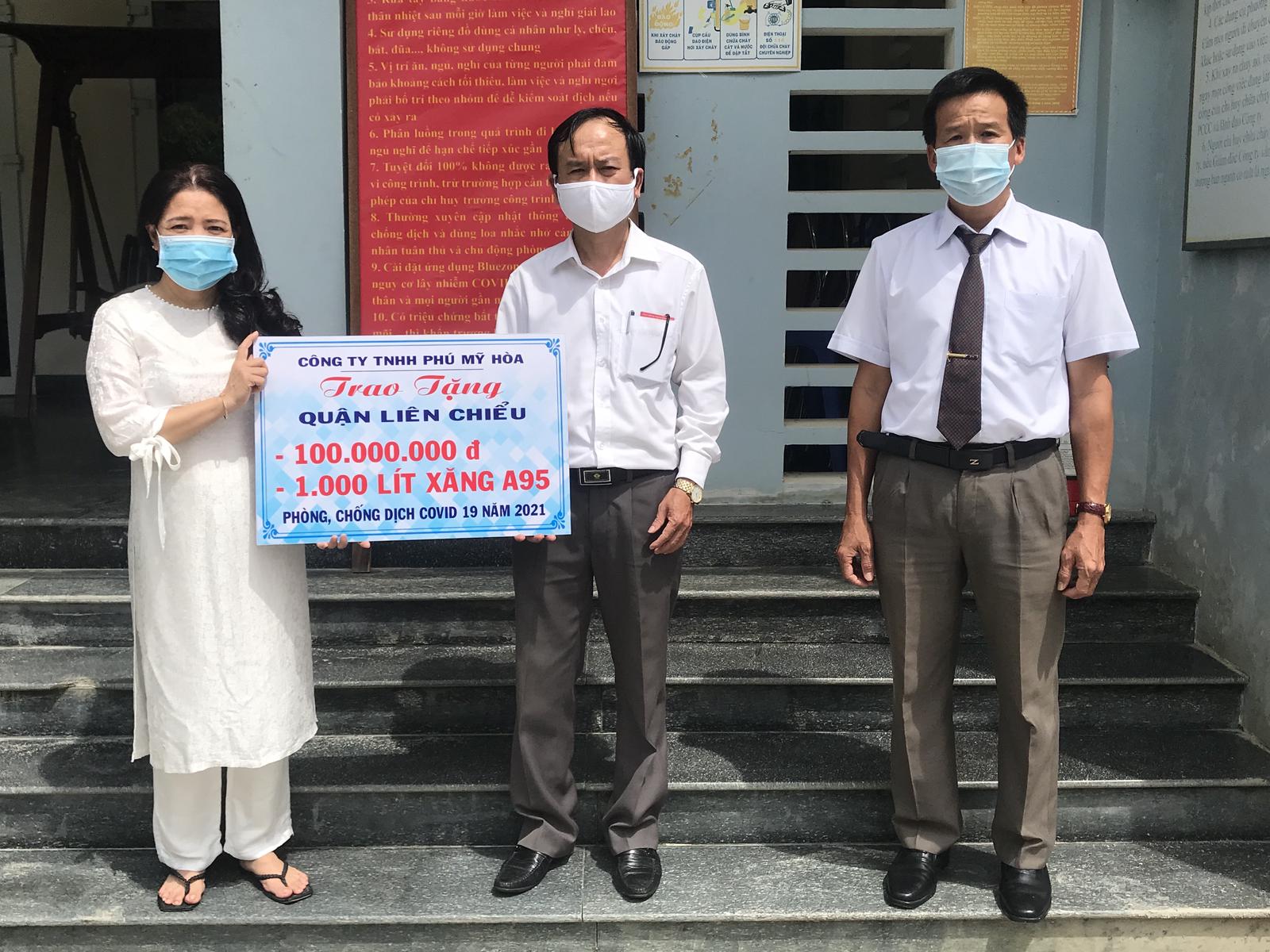 Giám đốc Công ty TNHH Phú Mỹ Hoà qua 2 lần hỗ trợ đã trao cho đại diện UBND quận Liên Chiểu 200 triệu đồng, cùng 1.000 lít xăng hỗ trợ lực lượng phòng, chống dịch bệnh trên địa bàn.