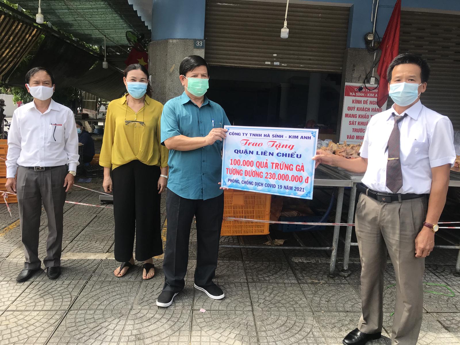 Cụ thể như: Vào sáng ngày 2/9, vợ chồng bà Hà Thị Sính - chủ Công ty TNHH Hà Sính - Kim Anh (phường Hoà Khánh Bắc, Liên Chiểu) đã trao cho UBND quận Liên Chiểu 100.000 quả trứng gà, trị giá 230 triệu đồng. Trước đó, doanh nghiệp này cũng đã trao tặng cho UBND phường Hoà Khánh Bắc 5.000 quả trứng gà để hỗ trợ cho người dân đang cách ly.