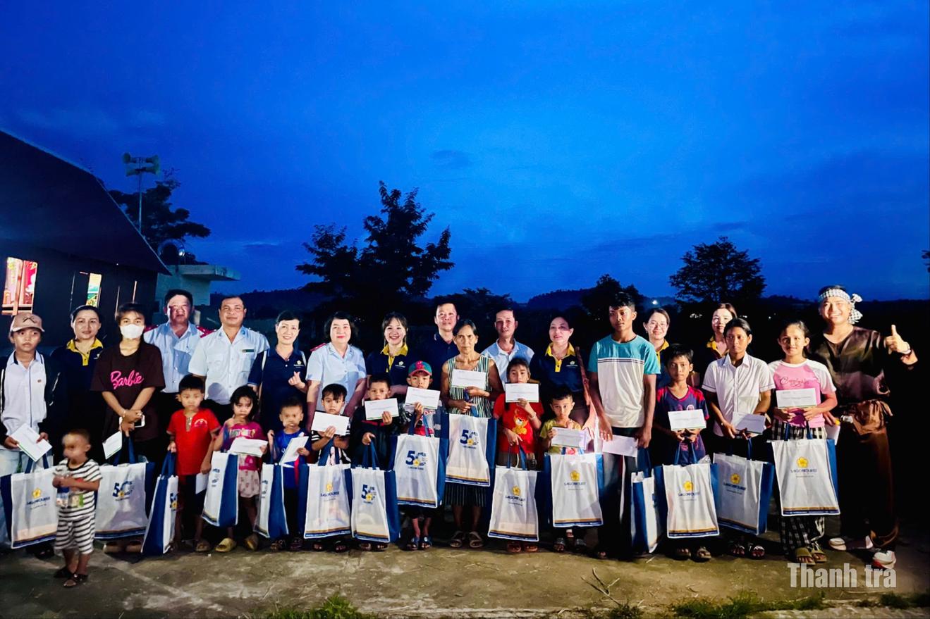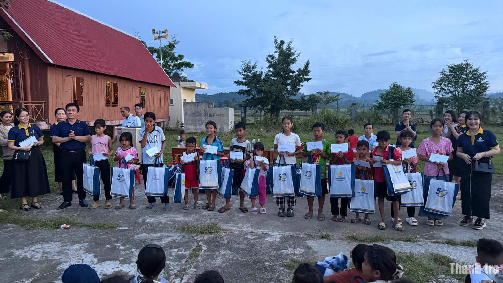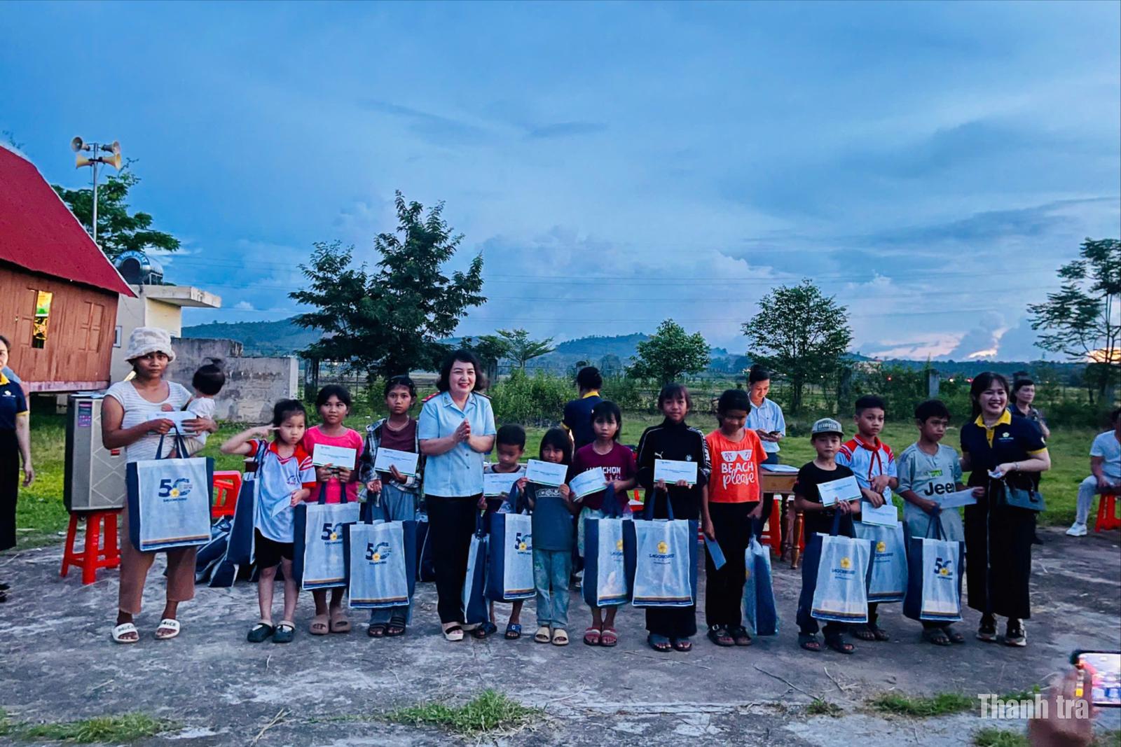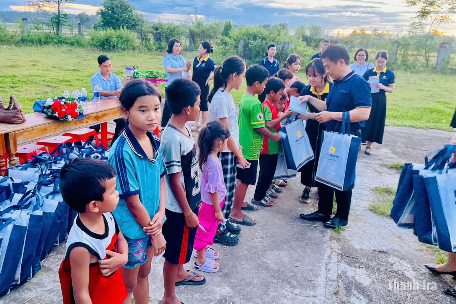 Đại diện Thanh tra tỉnh Đắk Lắk và Công ty Cổ phần Du lịch Đắk Lắk trao tặng những phần quà ý nghĩa, mang Trung thu ấm áp đến với các em nhỏ tại buôn Tuôr B, xã Ea Na. Ảnh: NG