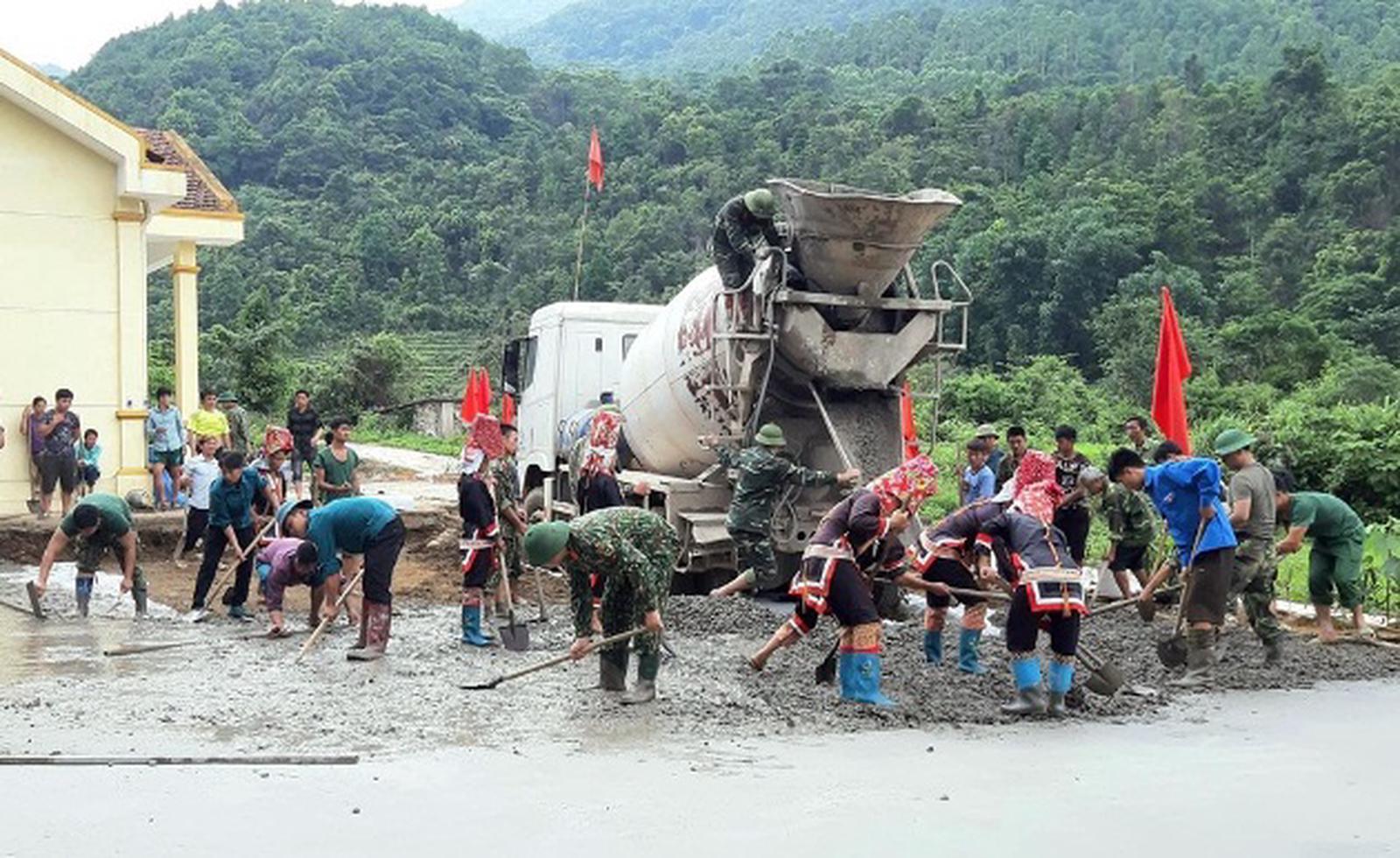 Cán bộ, chiến sĩ LLVT huyện Bình Liêu tham gia làm sân Nhà văn hóa thôn Khe Tiền (xã Đồng Văn), tháng 6/2020