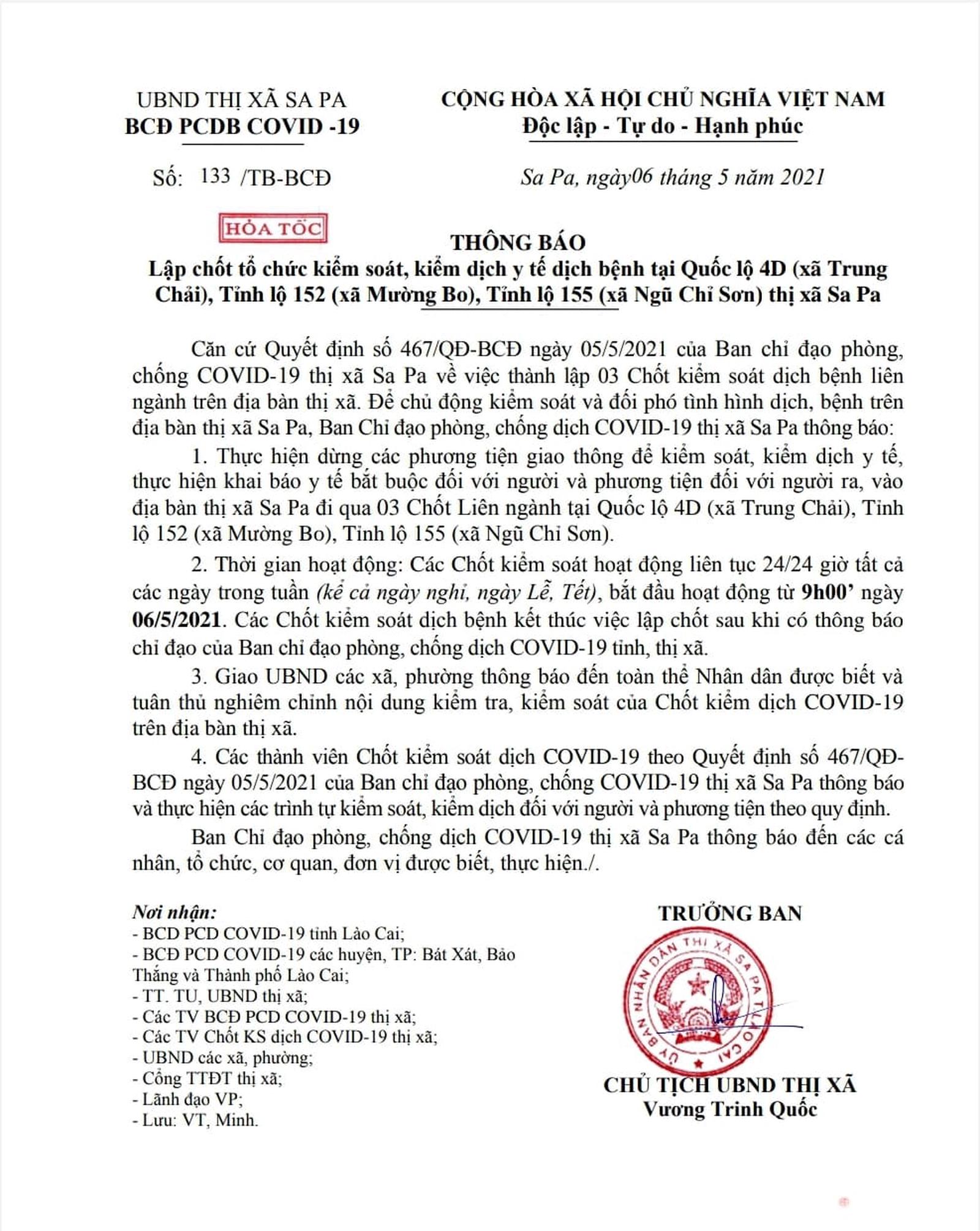 Theo đó, kể từ 9h00 ngày 6/5/2021, thị xã Sa Pa thành lập các chốt kiểm dịch y tế liên ngành tạm thời để phòng, chống dịch bệnh Covid -19 tại quốc lộ 4D trên đỉnh đèo Ô Qúy Hồ (xã Trung Chải), tỉnh lộ 152 (xã Mường Bo), tỉnh lộ 155 (xã Ngũ Chỉ Sơn) thị xã Sa Pa. Các chốt sẽ thực hiện nhiệm vụ cho đến khi có thông báo mới của Ban Chỉ đạo phòng, chống dịch Covid -19 tỉnh Lào Cai và thị xã Sa Pa.
